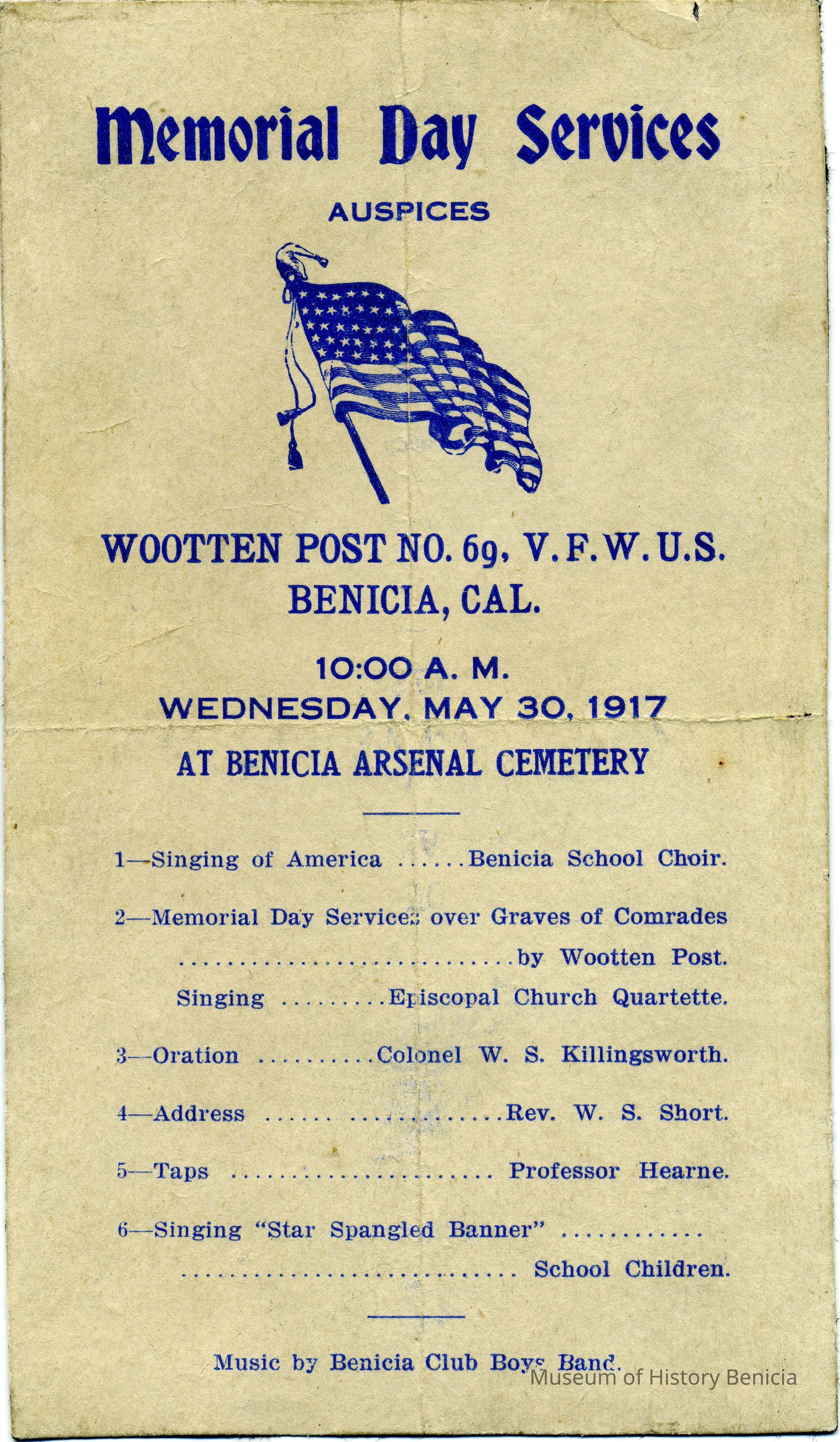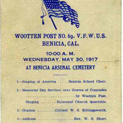 This is a brochure for the Memorial Day Service at the Benicia Military Cemetery for 05/30/1917. It was presented by Wootten Post No. 69 of V.F.W. U.S. in Benicia Ca. It was at the Benicia Arsenal Cemetery. The main speakers were Col. W.S. Killingsworth and Rev. W.S. Short.Collection