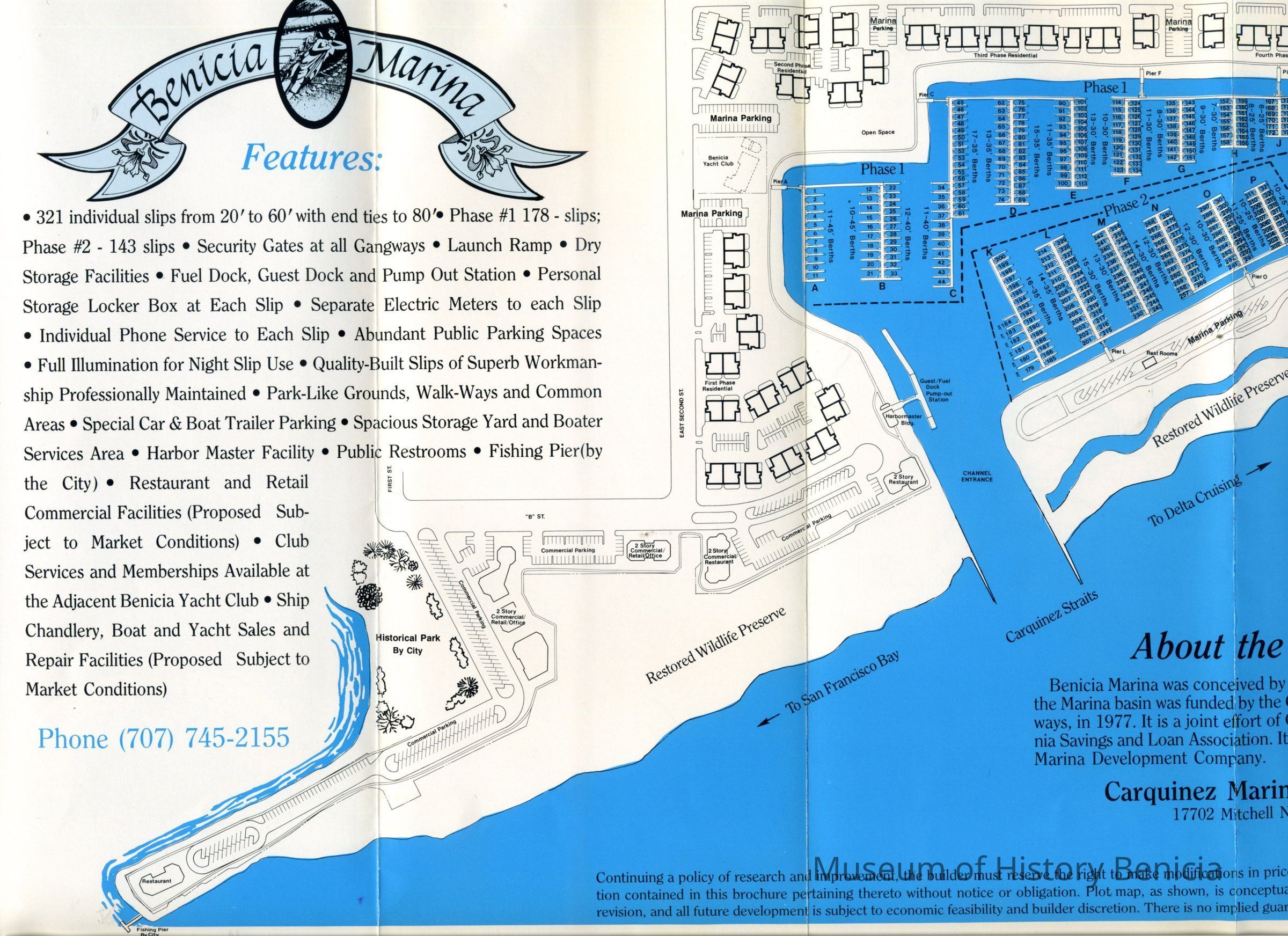This is a pamphlett for the Benicia Marina. It includes a map of the boat slips and the housing being built around the Marina.