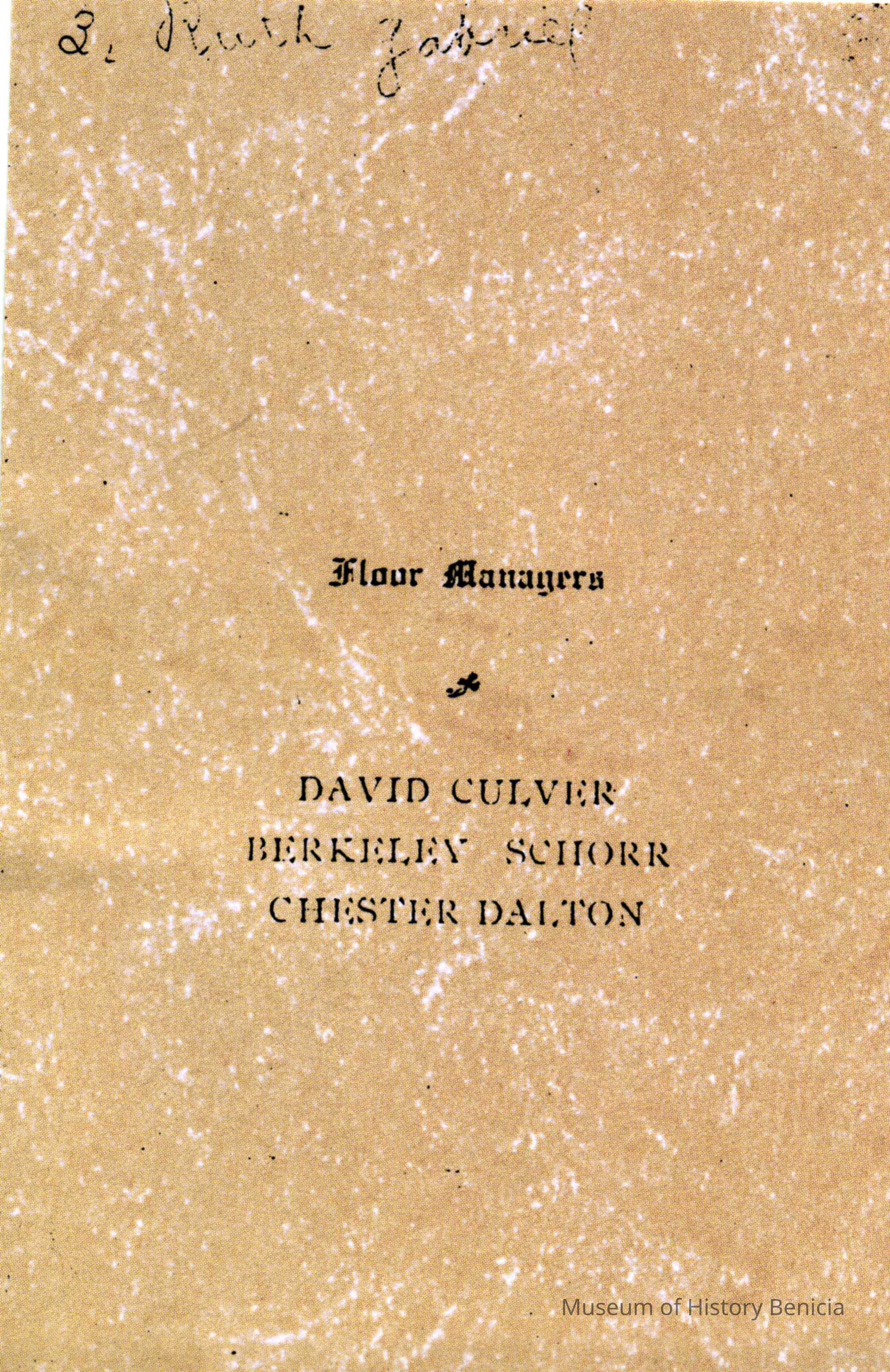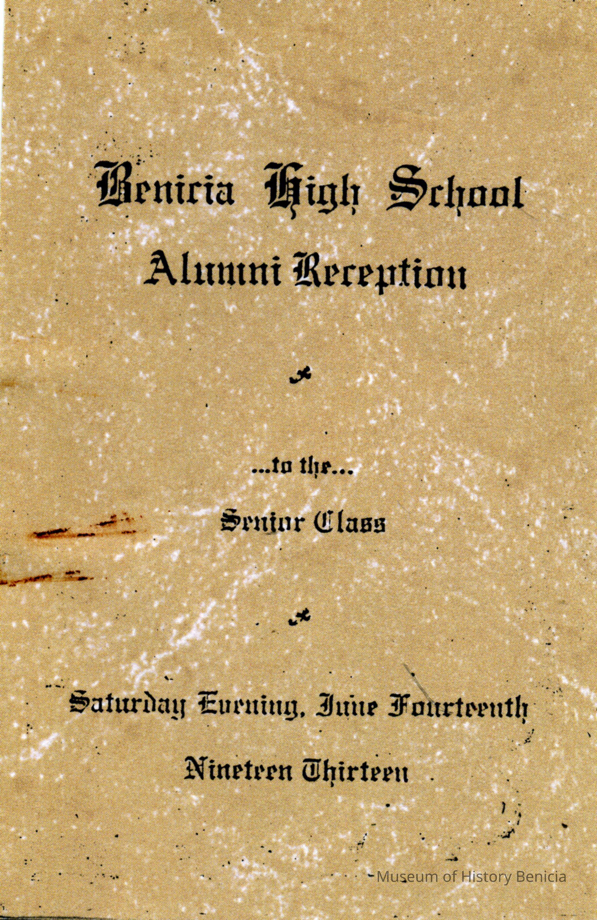 This is a copy of a pamphlet for the Benicia High School Alumni Reception of 06/14/1913.