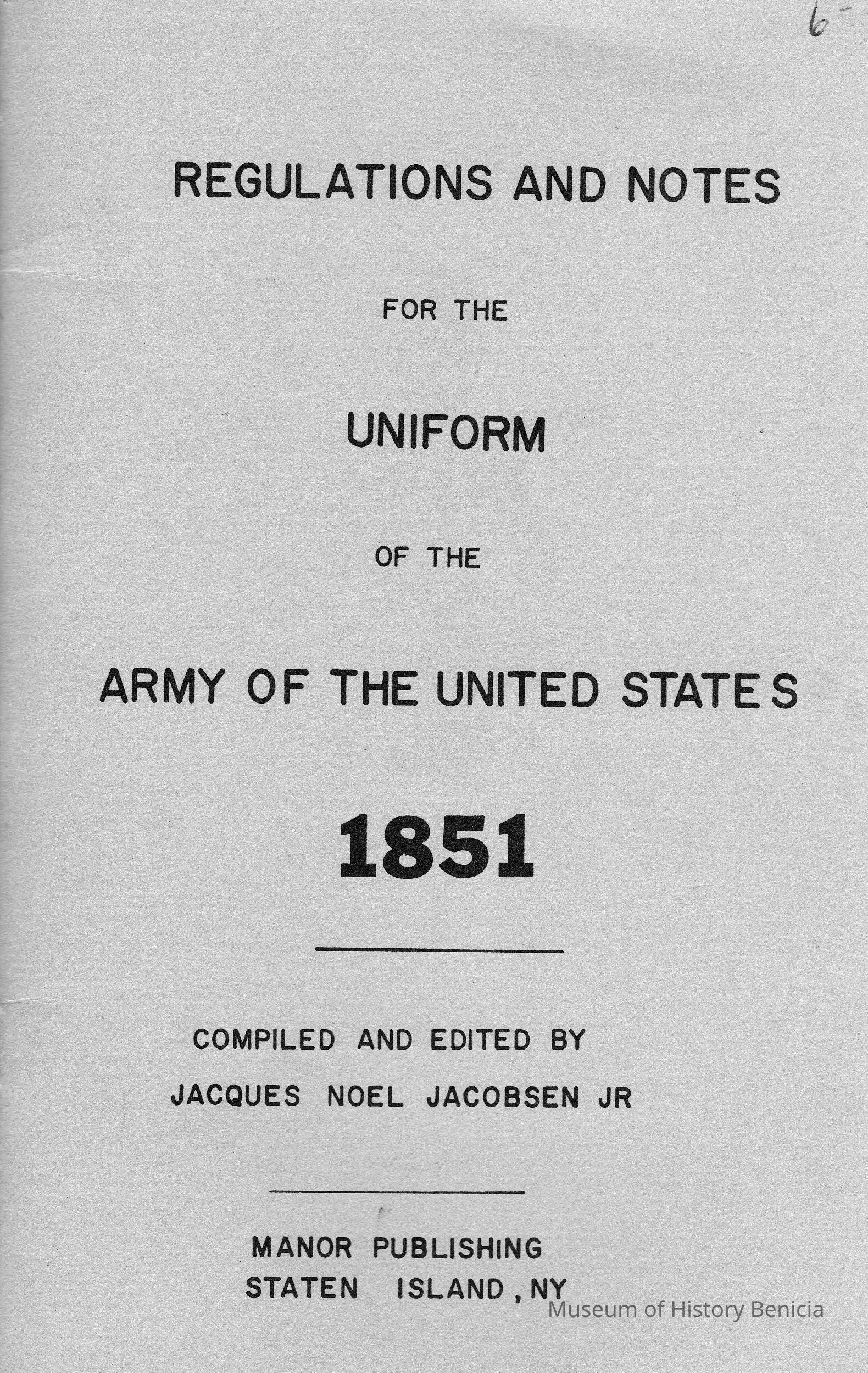 Softcover booklet "Regulations and Notes for the Uniform of the Army of the United States 1851" compiled and edited by Jacques Nol Jacobsen Jr. Manor Publishing, Staten Island NY copyright 1972; illustrations and reproduction of original regulationsCollection