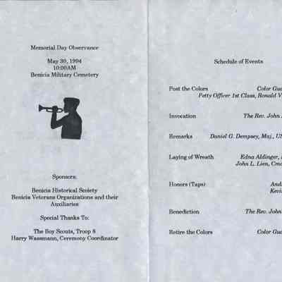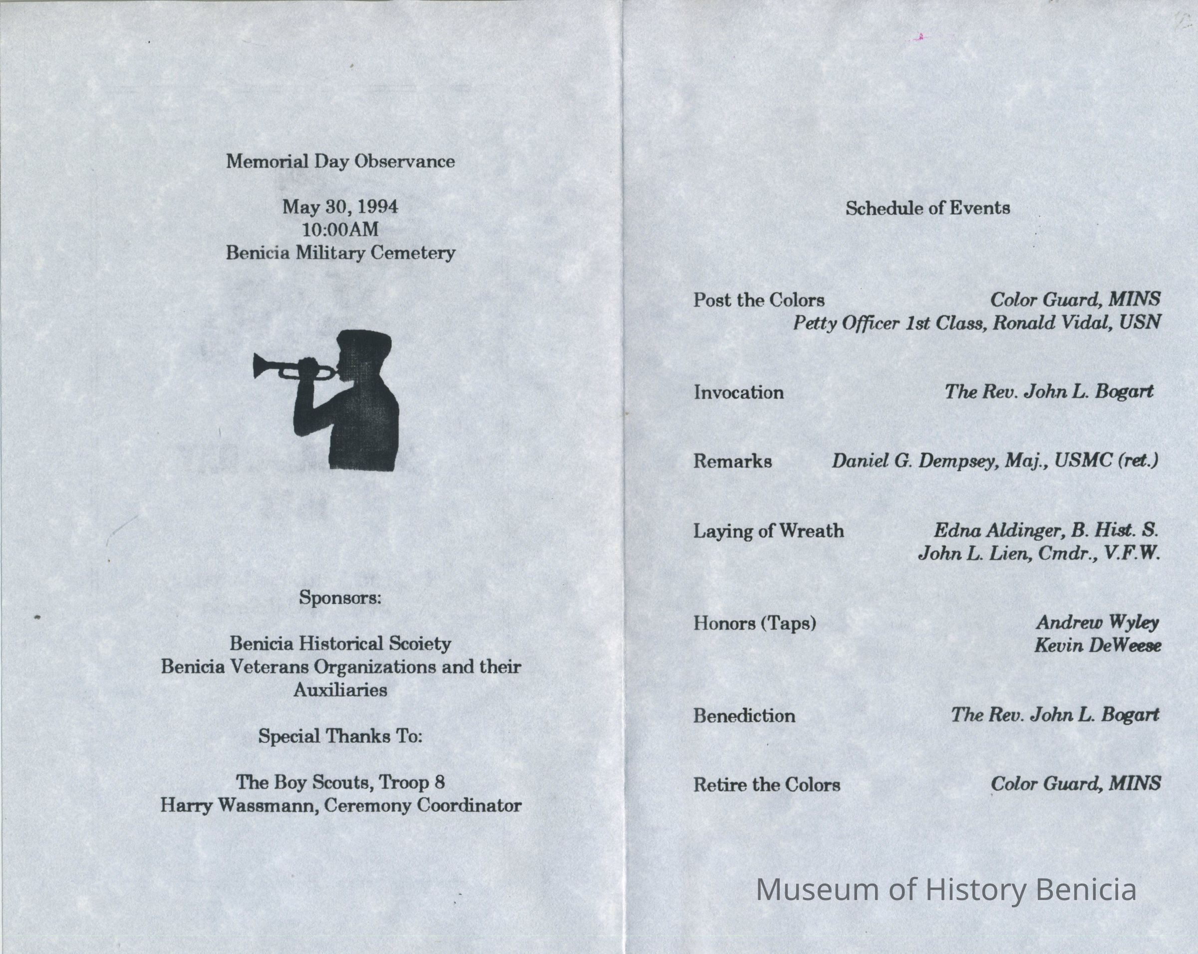 This is a brochure for the Memorial Day Service at the Benicia Military Cemetery for 05/30/1994. These observances became a tradition sponsored by the Benicia Historical Society. They started after the Society led by Harry Wassmann, pushed to have the cemetery rehabilitated in the early 1980's. The cooperation between the Society and the Sacramento Army Depot became a proud tradition in Benicia.Collection