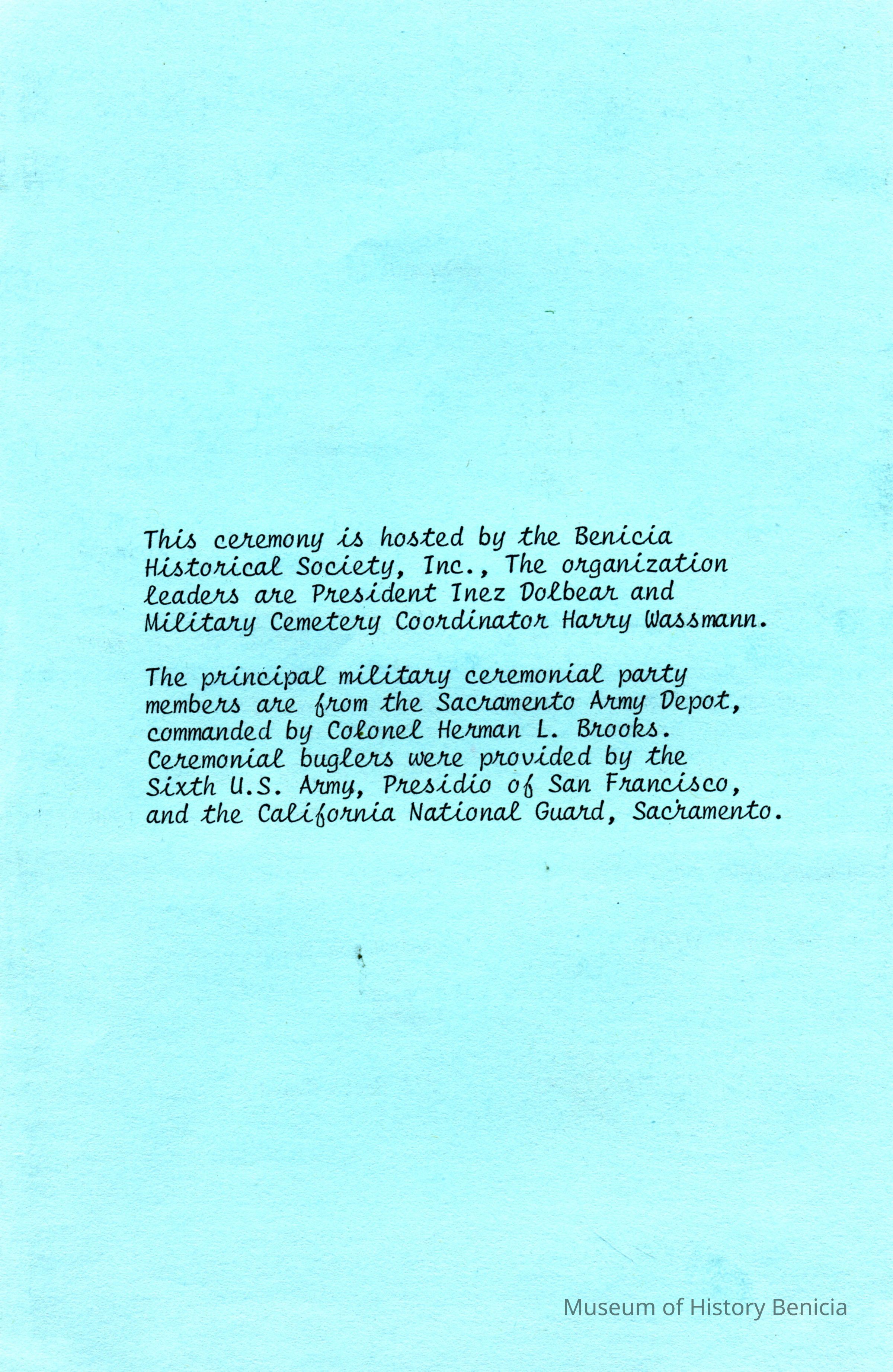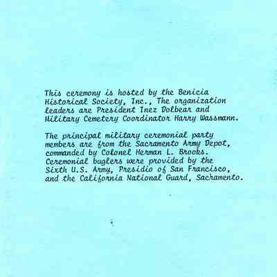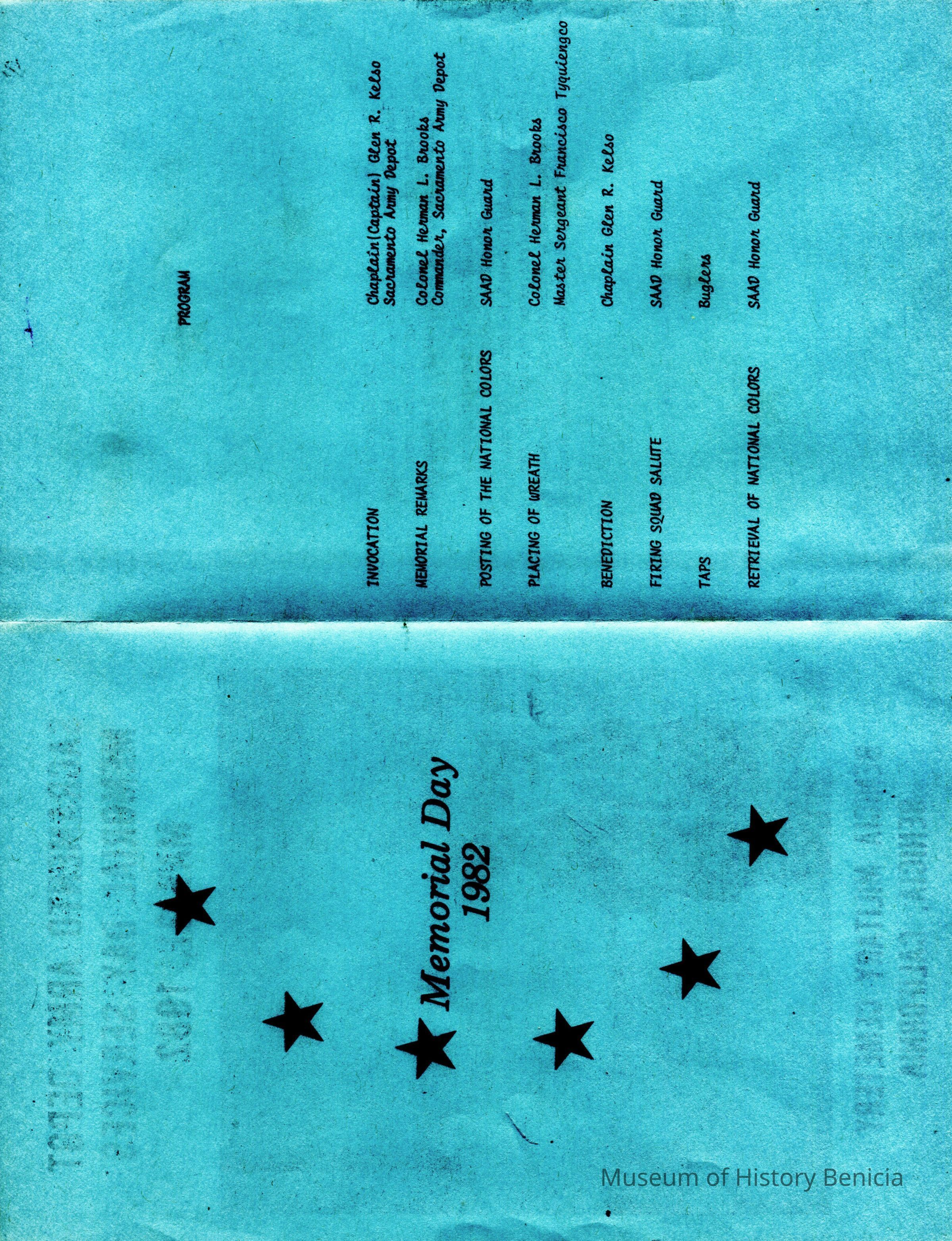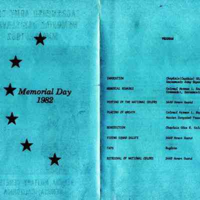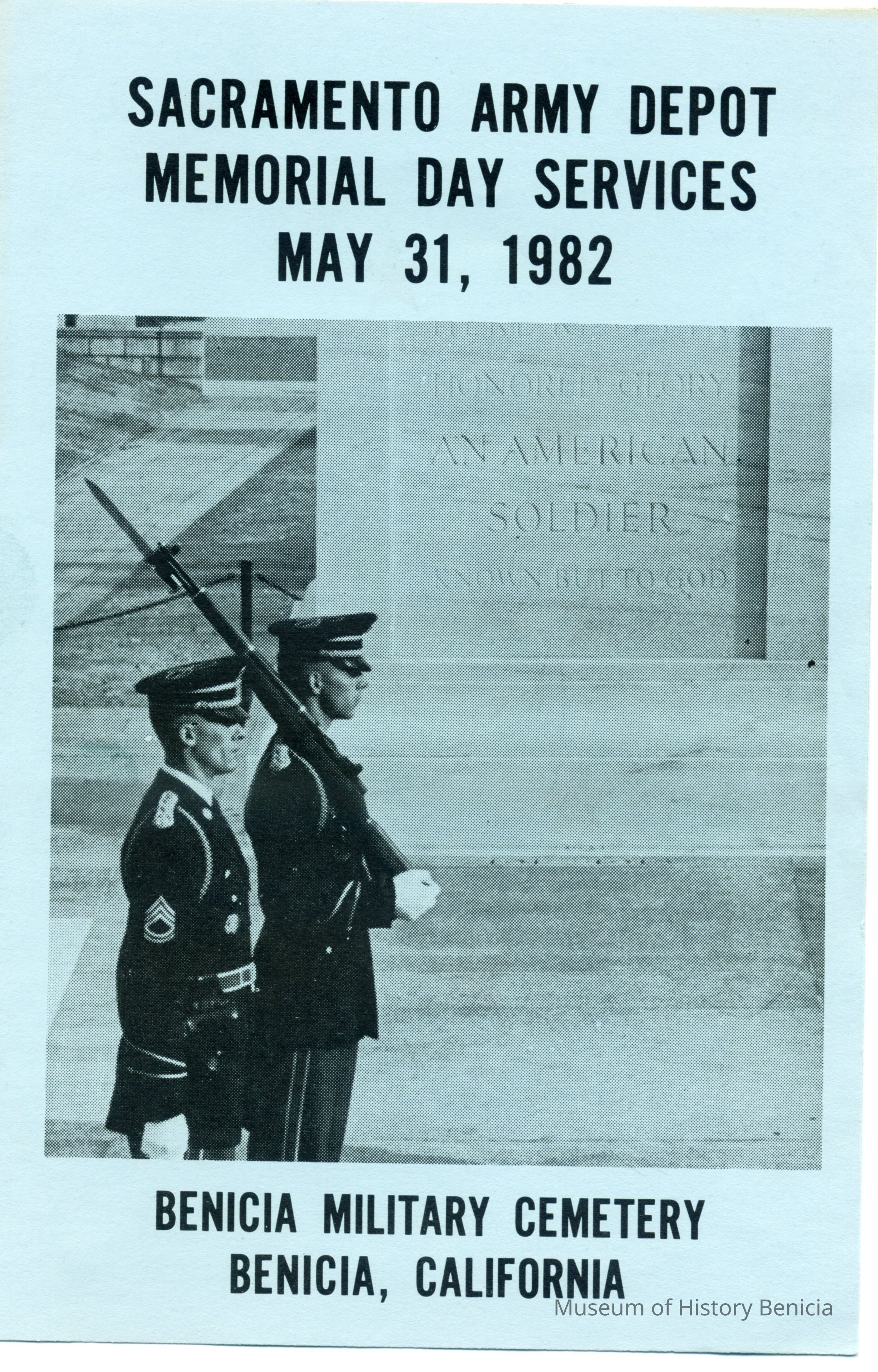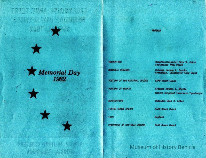 This is a brochure for the Memorial Day Service at the Benicia Military Cemetery for 05/31/1982. These observances became a tradition sponsored by the Benicia Historical Society. They started after the Society led by Harry Wassmann, pushed to have the cemetery rehabilitated in the early 1980's. The cooperation between the Society and the Sacramento Army Depot became a proud tradition in Benicia.Collection