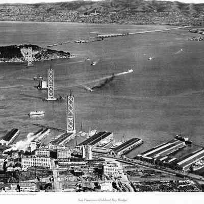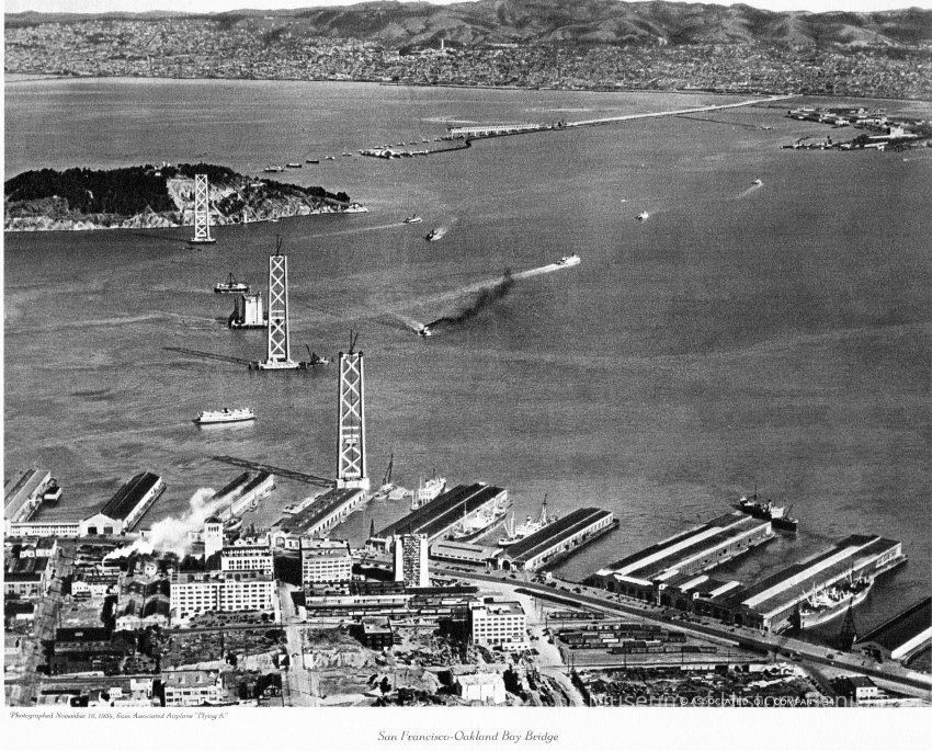 Aeriel view looking east from over San Ferancisco showing the construction of the San Francisco Bay Bridge including the Yerba Buena cantilevered bridge construction.Collection