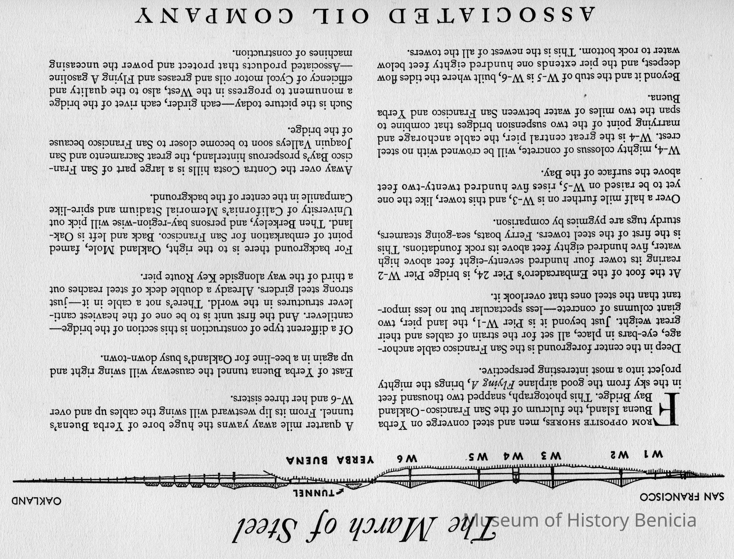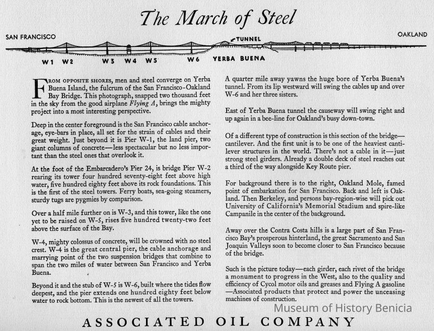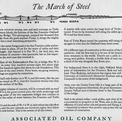 One of a series of eleven pamphlets published by The Associated Oil Company and addressed to Mr.E. B McNear. Each piece is a 9"x24" folded stock with a full page photograph plus a facing page of explanatory verbage. Ten of which involve the building of the Golden Gate Bridge and San Francisco Bay Bridge Both bridges commenced contruction in 1933. The eleventh pamphlet is similiar but involves the Tacoma Narrows Bridge project.