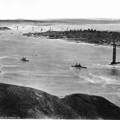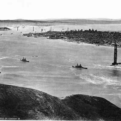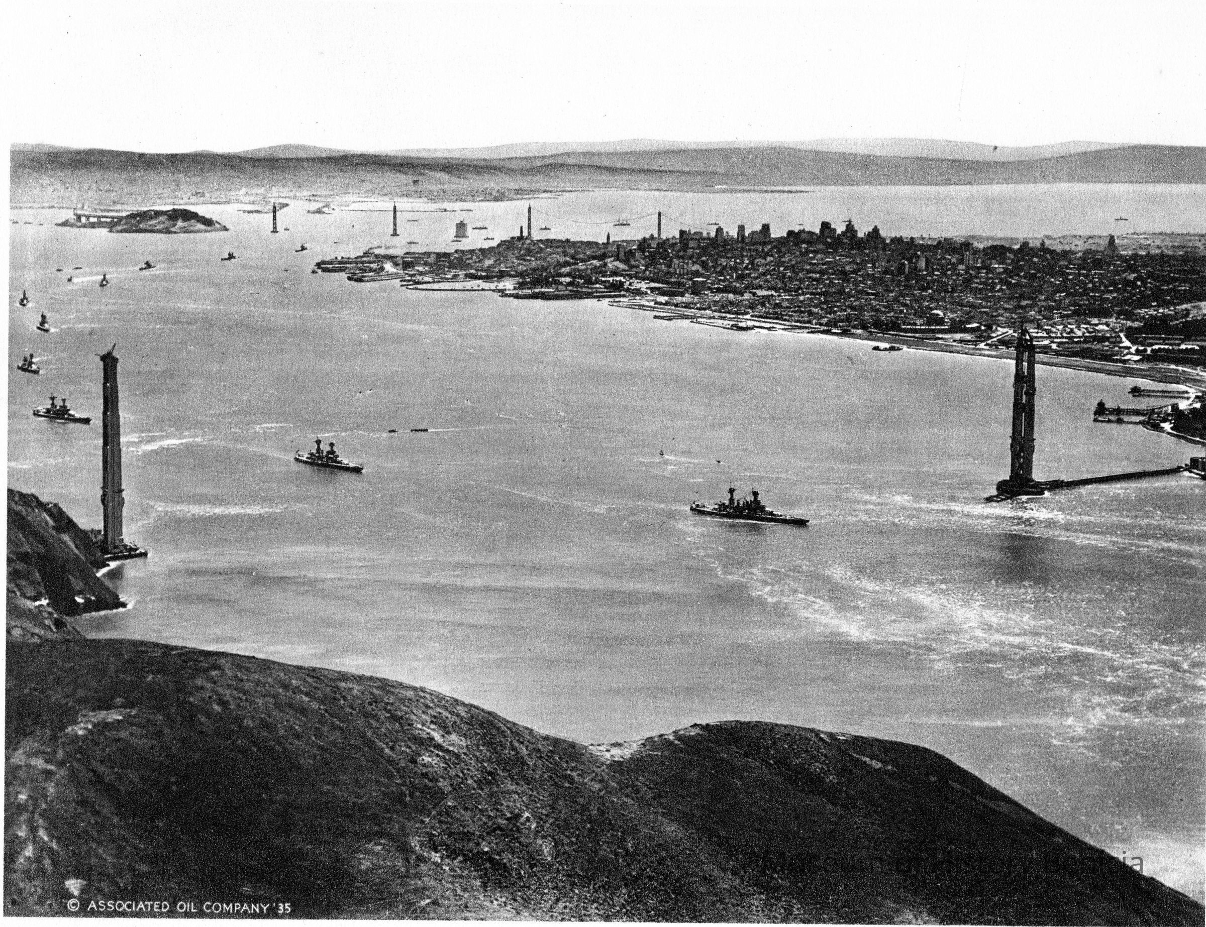 The photo is an aerial view of the Golden Gate Bridge construction from the Marin Headlands showing both towers essentially completed plus the towers of the Bay Bridge and showing over a dozen Navy Ships steaming out the Bay
