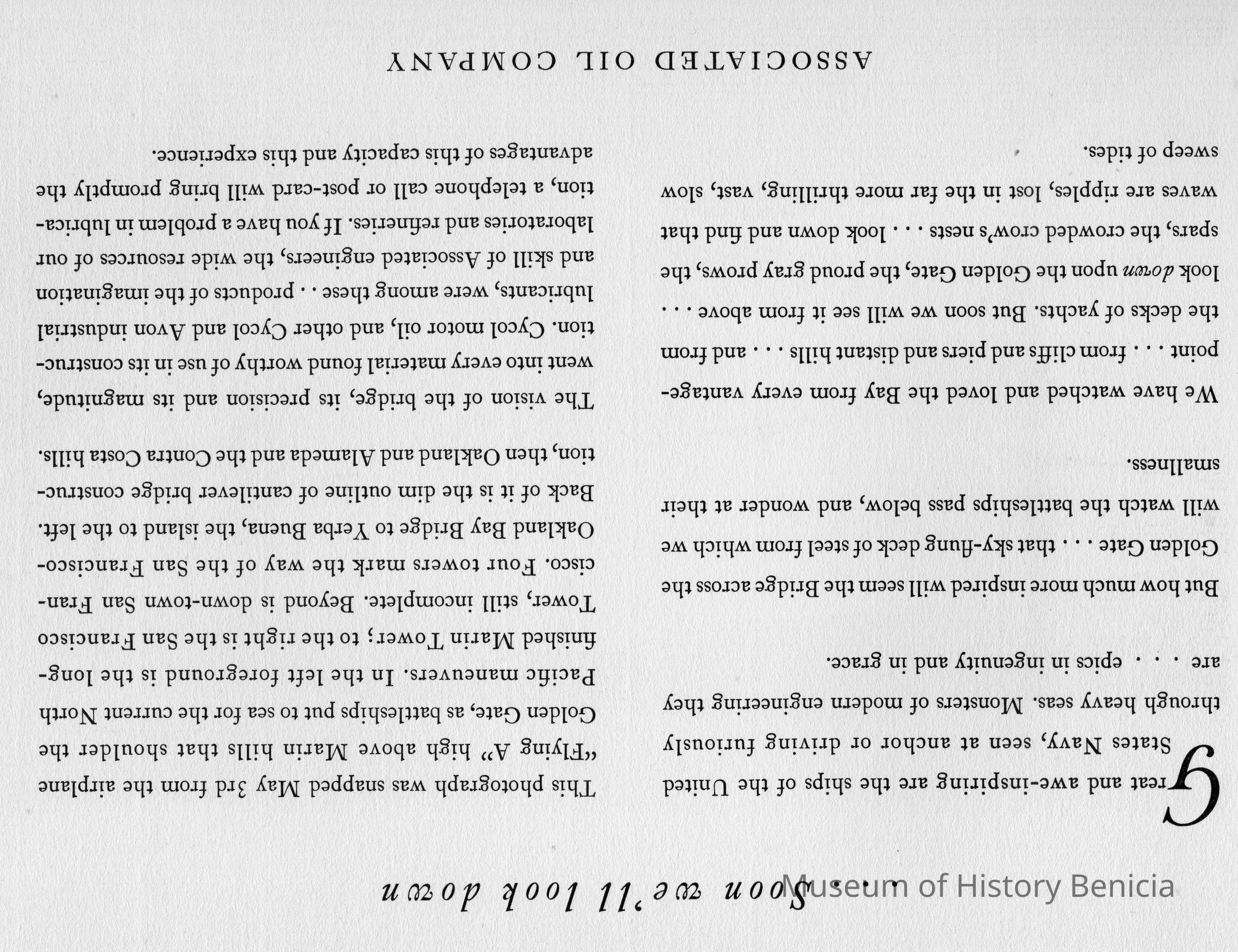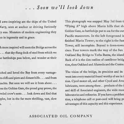 One of a series of eleven pamphlets published by The Associated Oil Company and addressed to Mr.E. B McNear. Each piece is a 9"x24" folded stock with a full page photograph plus a facing page of explanatory verbage. Ten of which involve the building of the Golden Gate Bridge and San Francisco Bay Bridge Both bridges commenced contruction in 1933. The eleventh pamphlet is similiar but involves the Tacoma Narrows Bridge project.