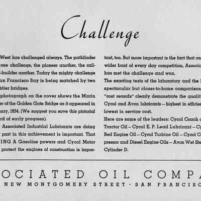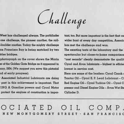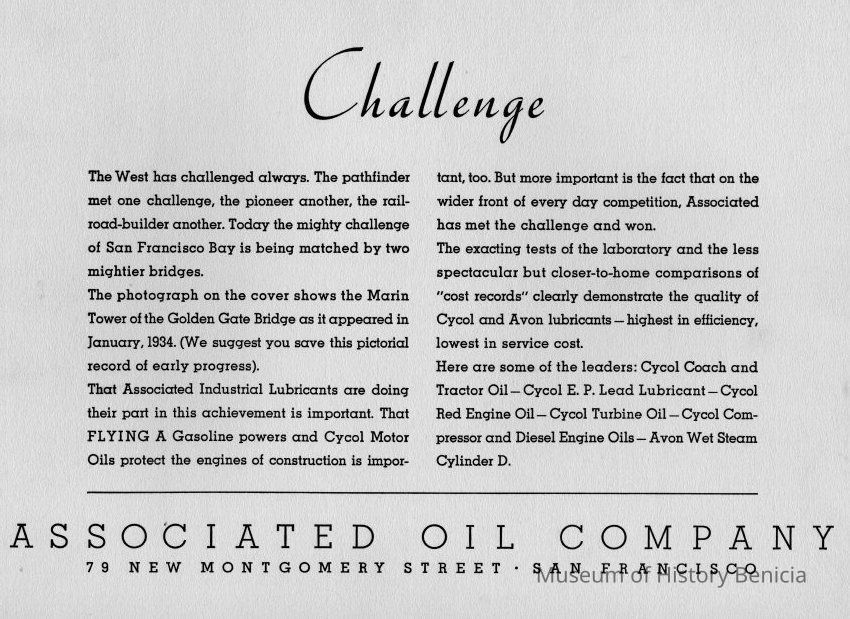 One of a series of eleven pamphlets published by The Associated Oil Company and addressed to Mr.E. B McNear. Each piece is a 9"x24" folded stock with a full page photograph plus a facing page of explanatory verbage. Ten of which involve the building of the Golden Gate Bridge and San Francisco Bay Bridge Both bridges commenced contruction in 1933. The eleventh pamphlet is similiar but involves the Tacoma Narrows Bridge project.