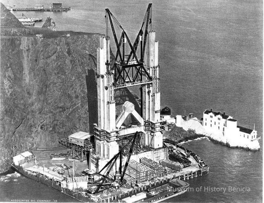 Detailed arial view of the Golden Gate Marin Tower in January 1934, one year after the start of construction.