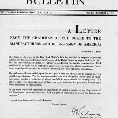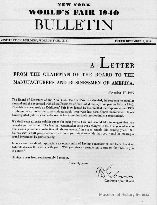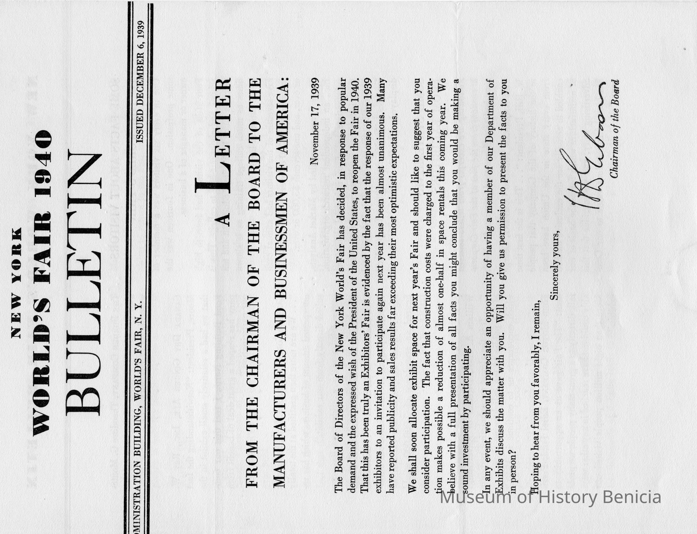 Four page Letter from the Chairman of the Board to the Manufactures and Businessmen of America, dated November 17, 1939 and addressed also to Mr. E. B. McNear, Presl, McNear Co., San Rafael, Calif.Collection