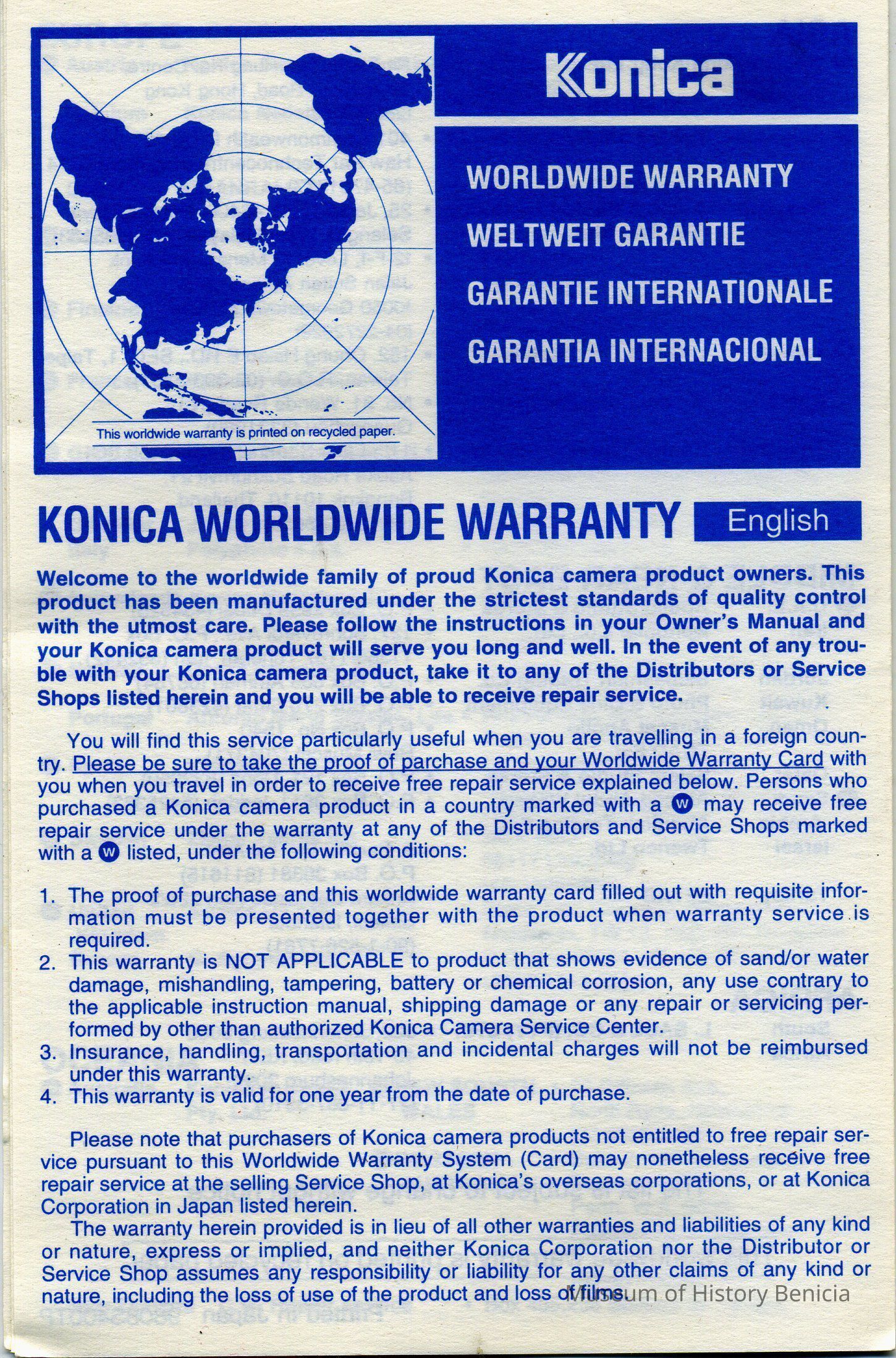 This is a pamphlet for applying for a warranty on a Konica camera.