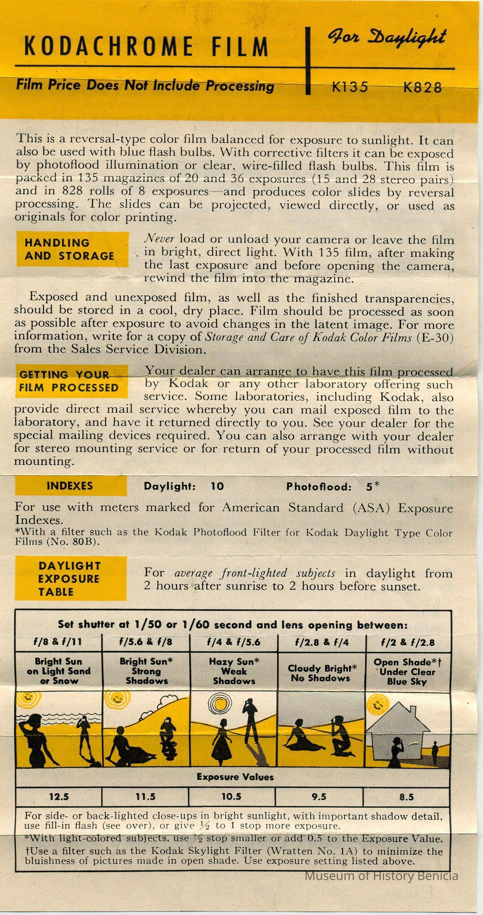 This is an instruction sheet that came with 35mm film. This one is for Kodachrome film Daylight Type 135 or 828.