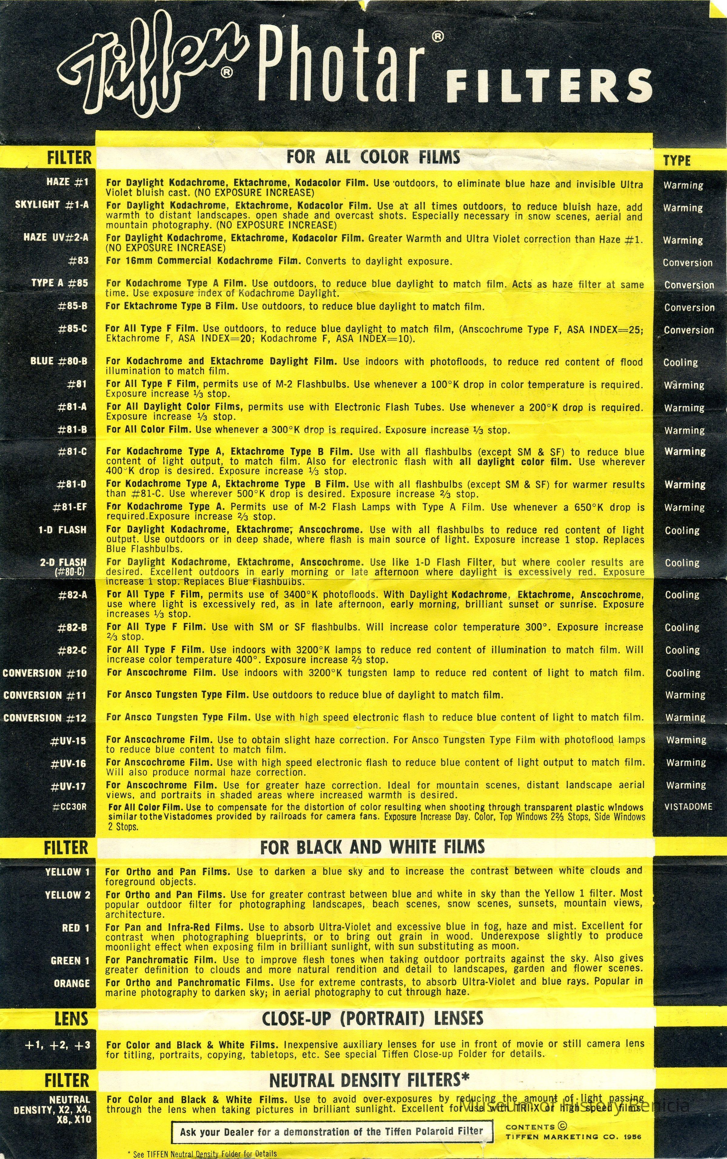 This is a sheet that came with Tiffen filters. It shows all of the different types of Tiffen "Photar" filters.