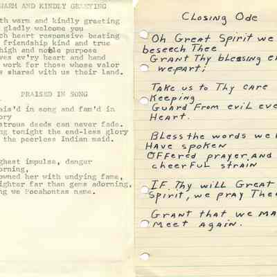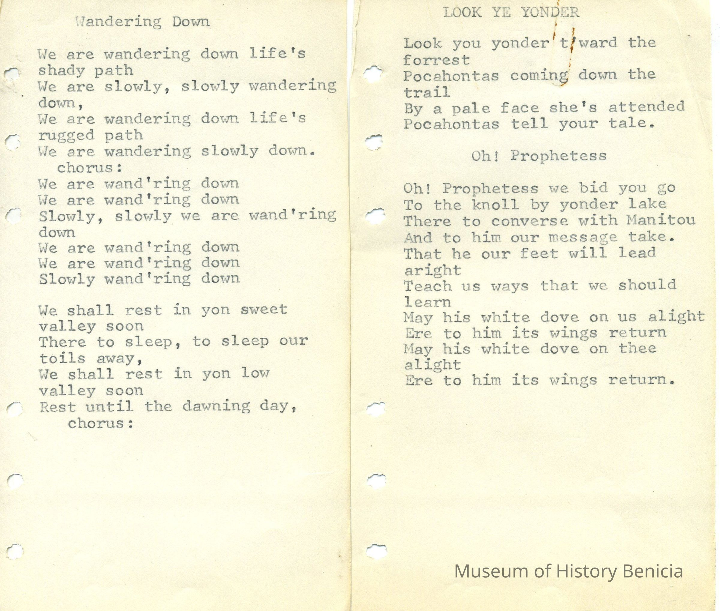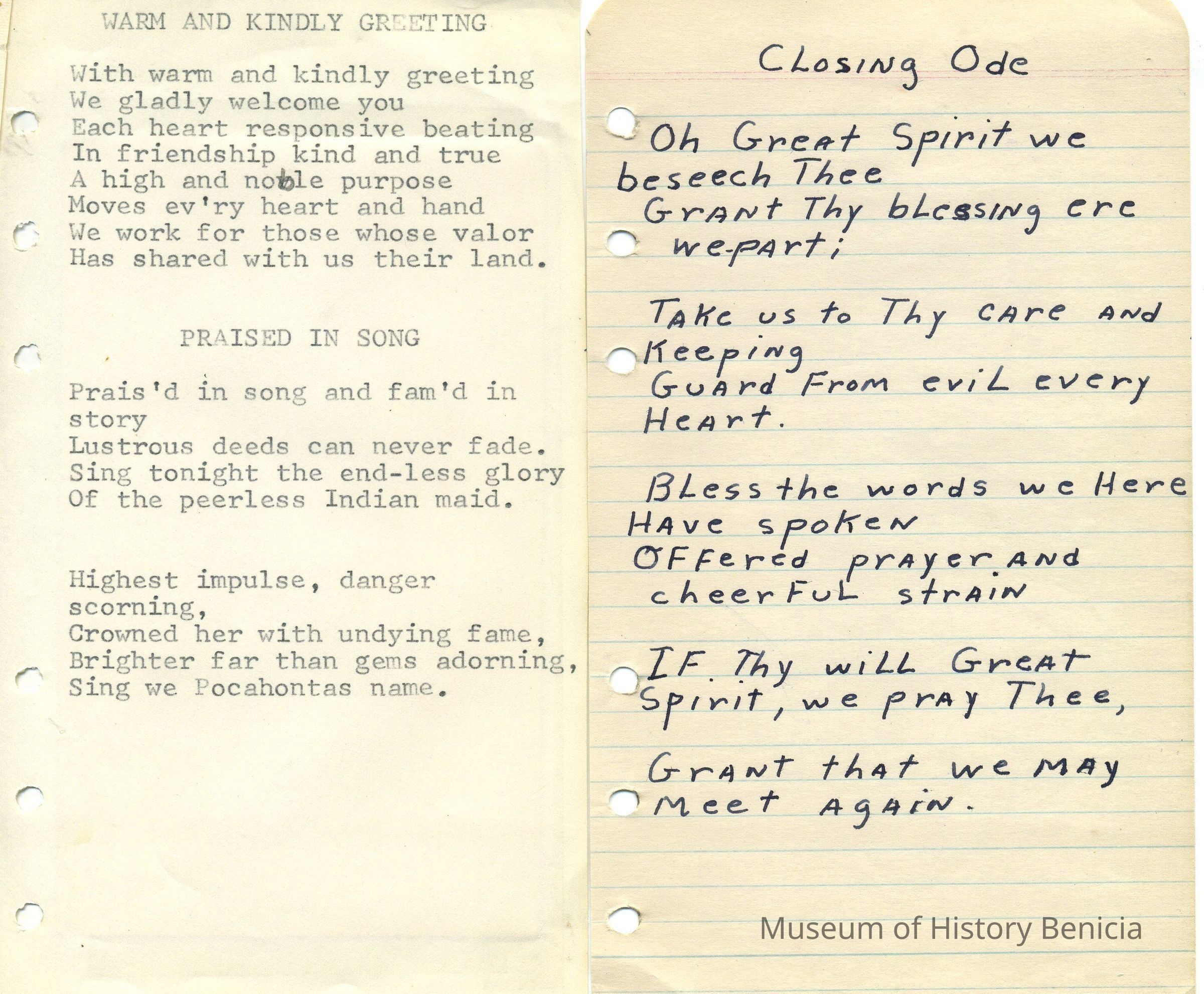 Ritual Songs/Recitations for meetings of Solano Council No. 245 Degree of Pocahontas, Benicia, California