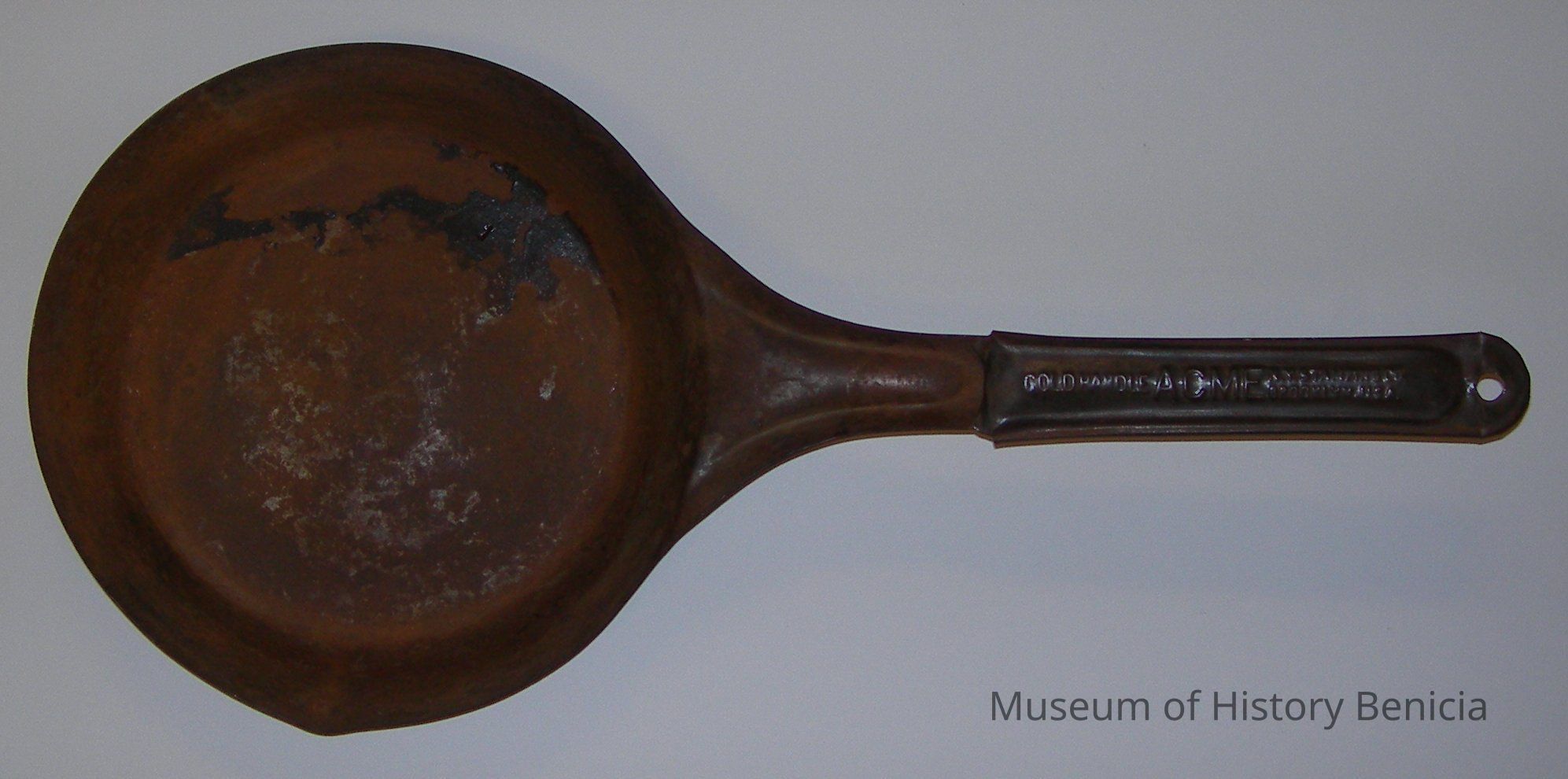 Metal frying pan with long handle that has raised lettering: "Cold handle ACME Brooklyn U.S.A."; there is an extra piece on the handle which allows an air space between the pieces to supposedly keep the handle cooler;