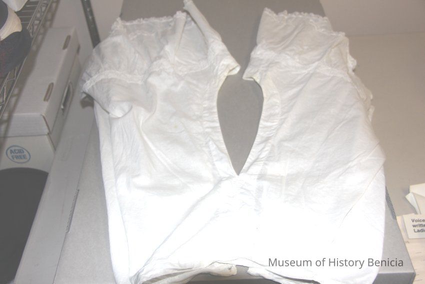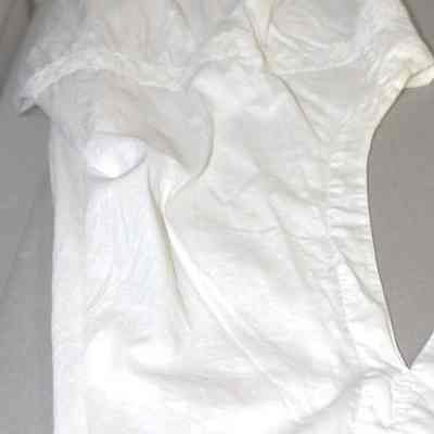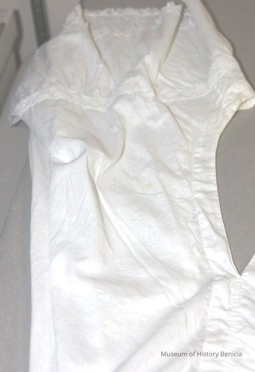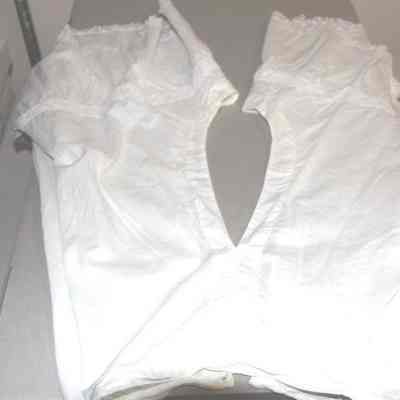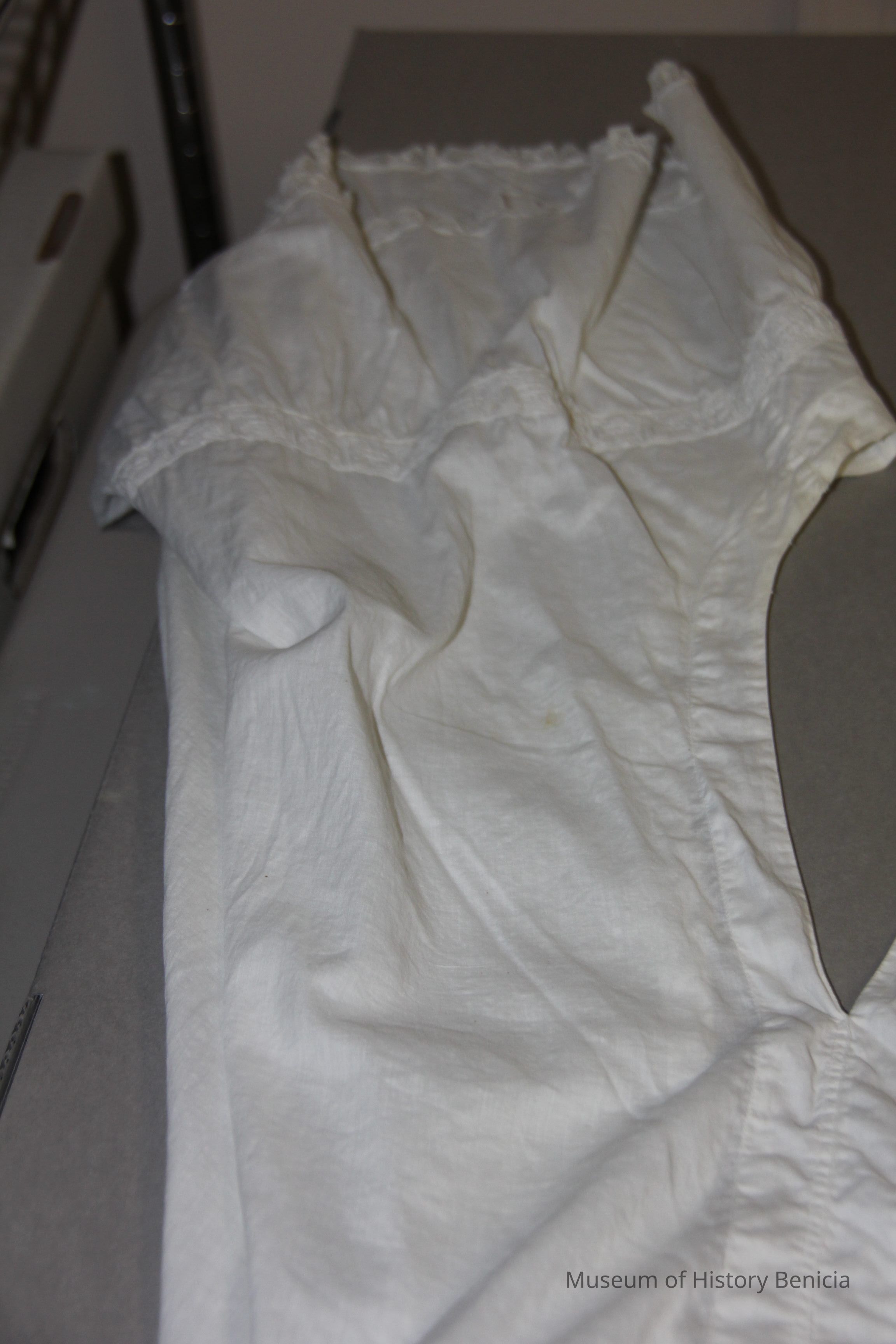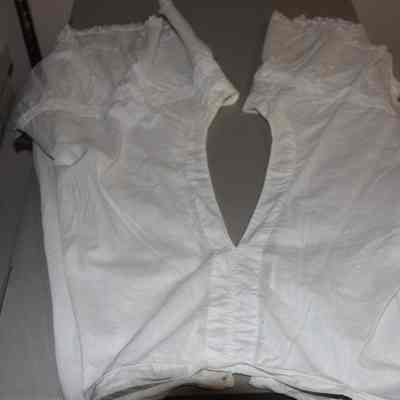 White pantalette with lace at the borders embroidered small flowers on a vine at the corners. 1" squares around legs. The back is opened. From the top of the pantalettes to about 1 foot down.Collection