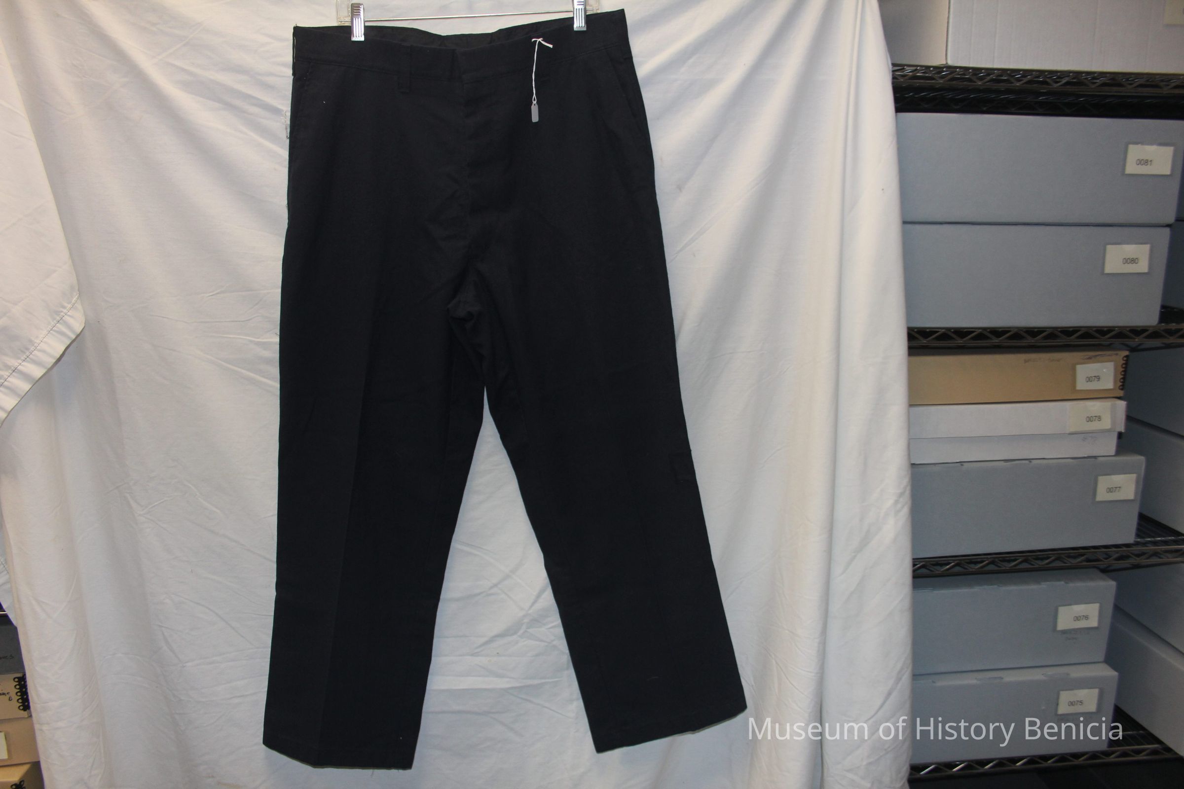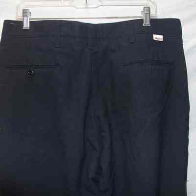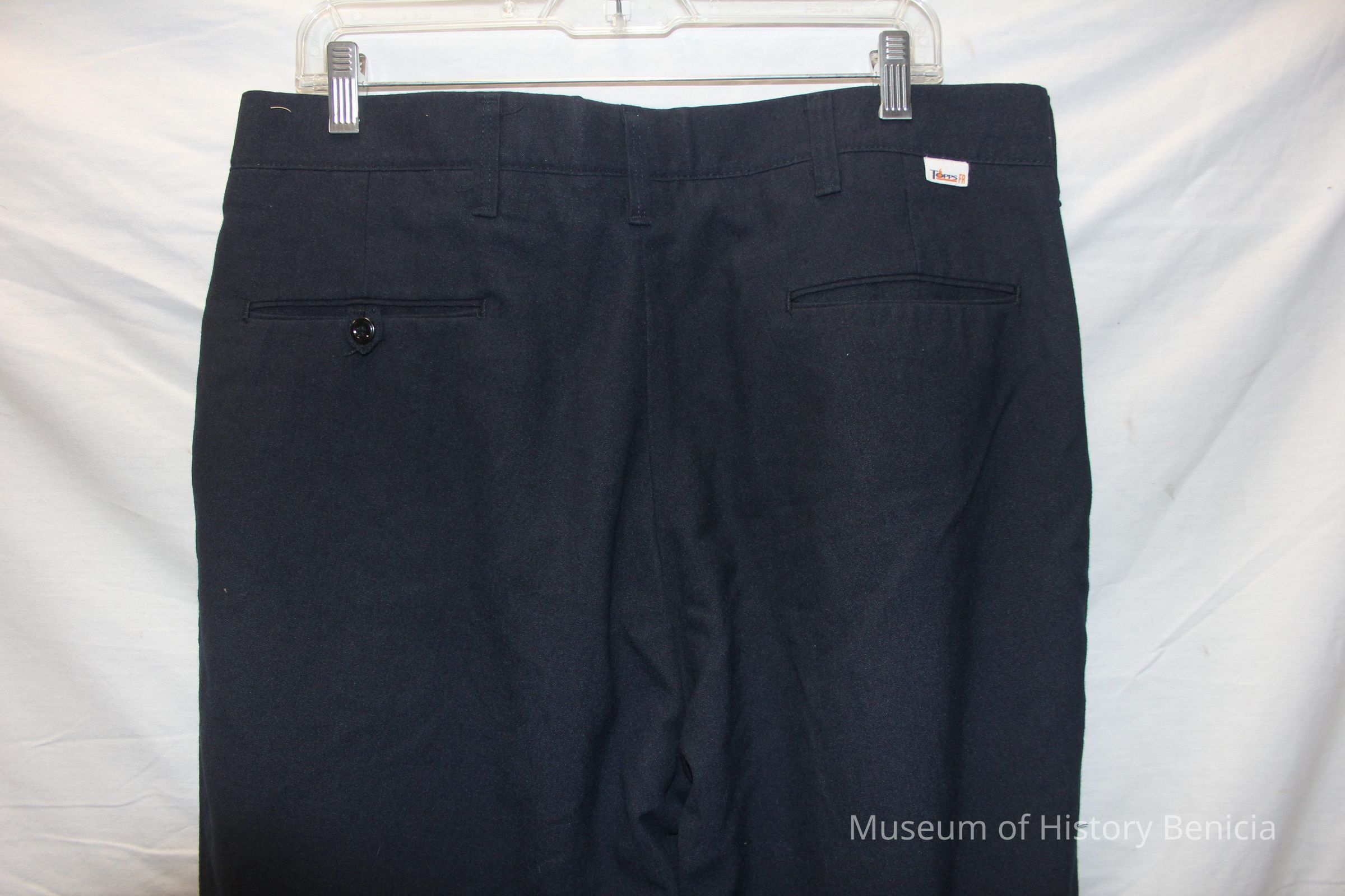 Dark blue khaki pants. Size L. Brand is "Topps Safety Apparel, Inc." Also has Nomex safety label with care instructions.