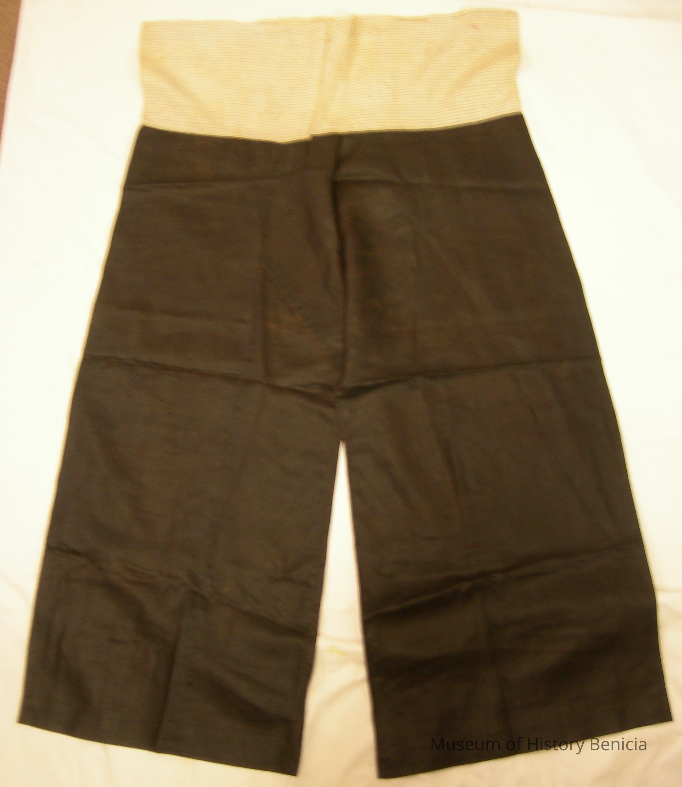Pants - Asian-style, wide legs, black, rough silk, 7" band at waist - grey with thin blue lines; size unknown.
