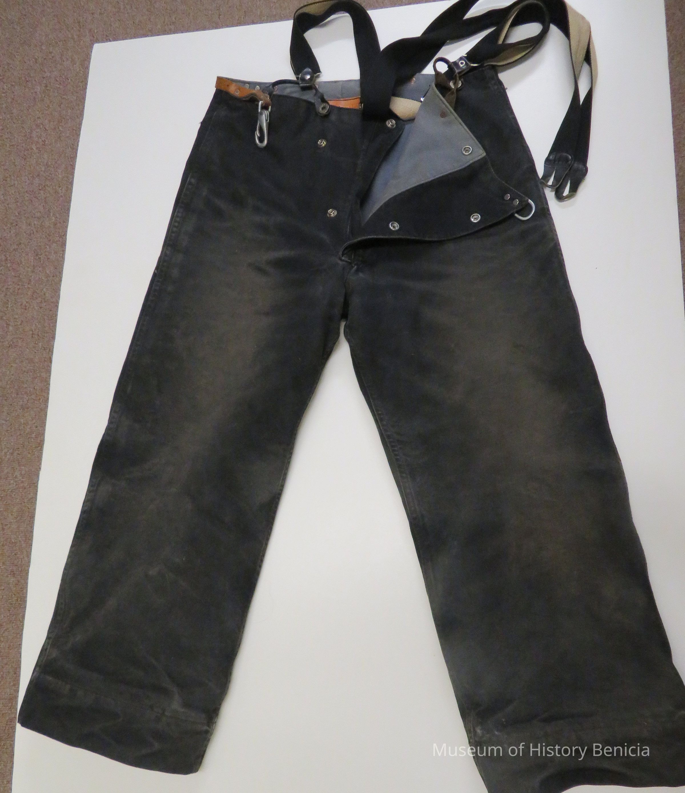 Black demin firepants with suspenders. Leather tag on inside reads: "C.A. Hoffman & Son Manufacturers, Arlington, Calif. Size 36 28"