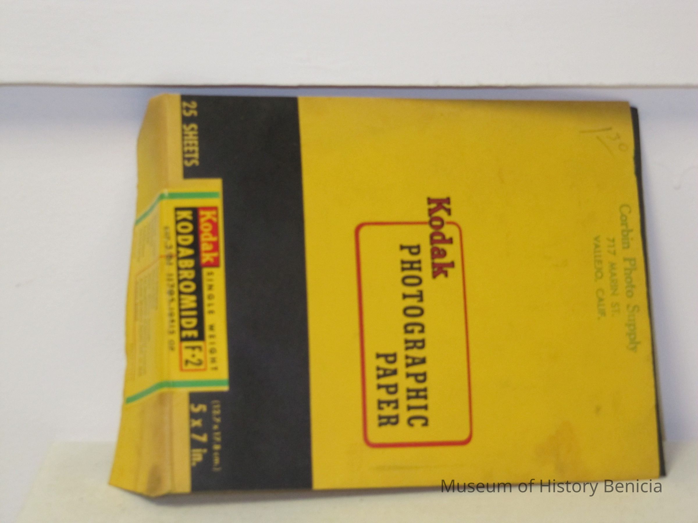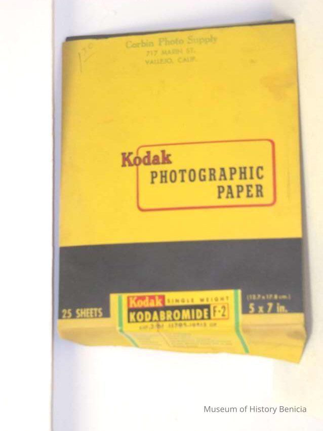 Envelope with photo paper from the Kodak co. dated 09/1960. 5 x 7 package has been opened and contains about 15-20 sheets. Stamped on front "Corbin Photo Supply 717 Marin St Vallejo, CACollection