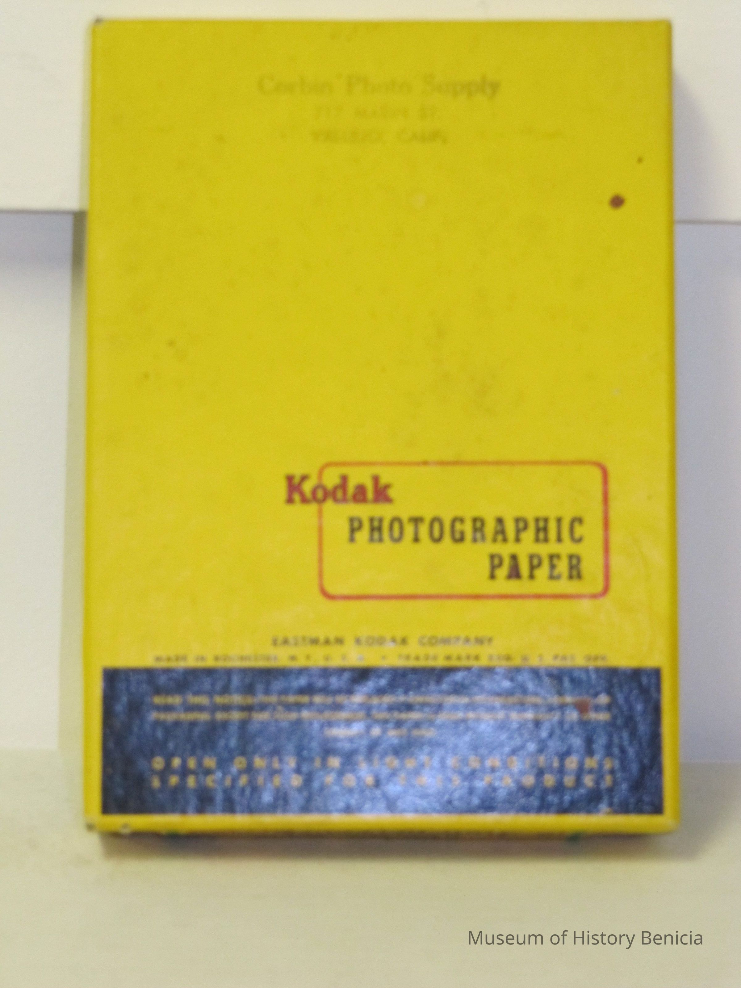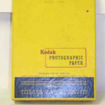 Box with photo paper from the Kodak co. dated 05/1960. 5 x 7 package has been opened and contains about 100 sheets. Stamped on front "Corbin Photo Supply 717 Marin St Vallejo, CACollection