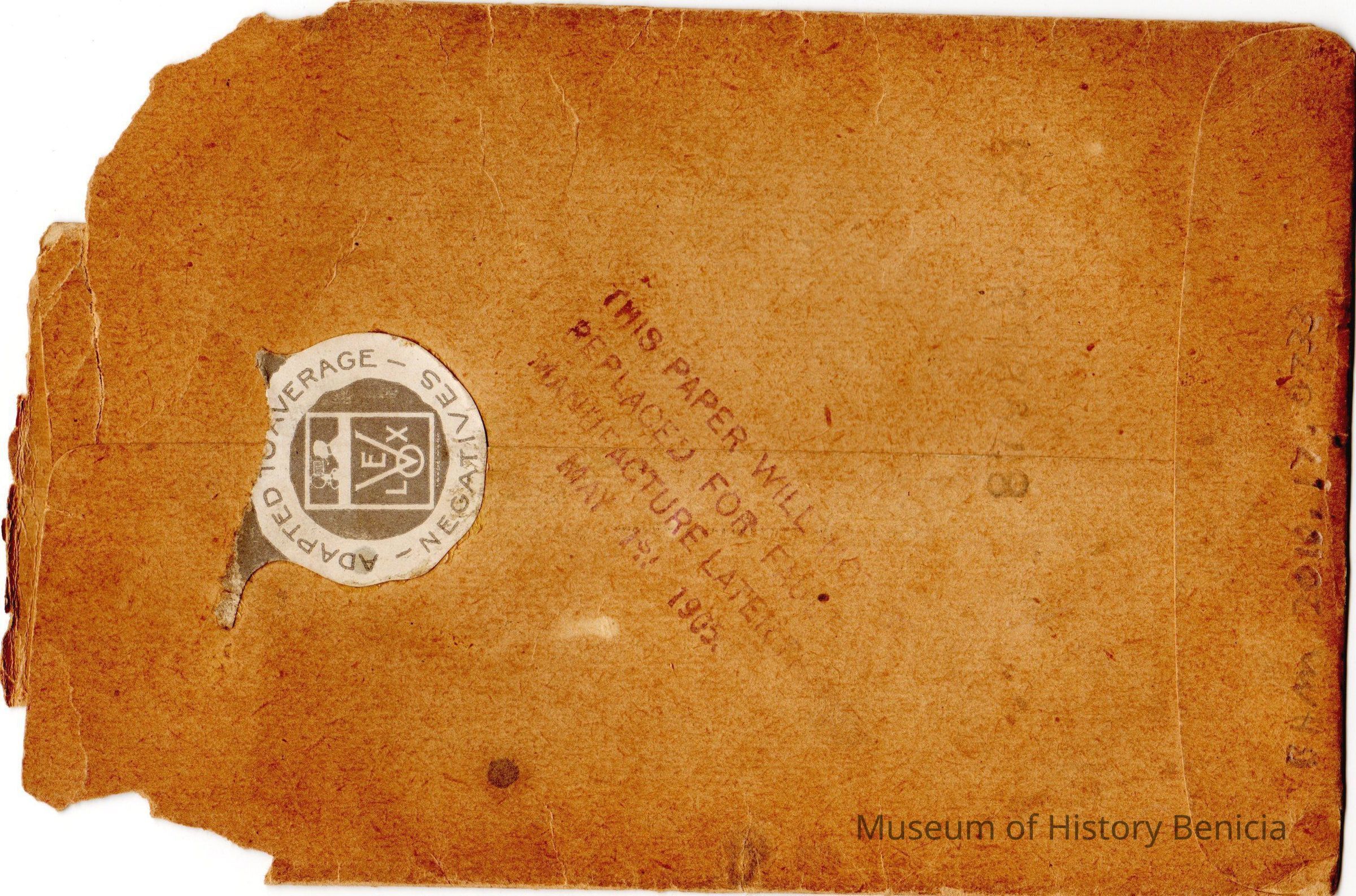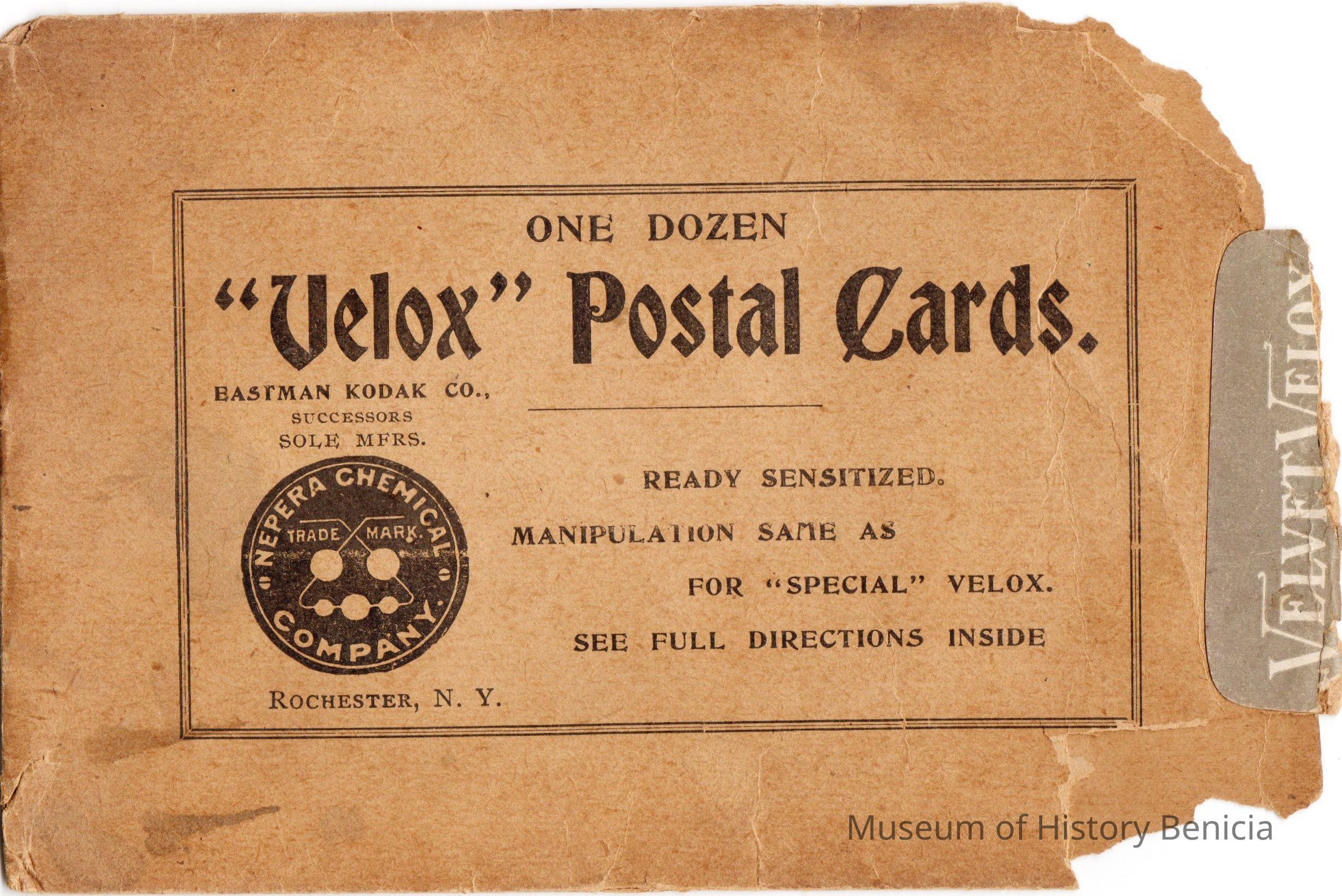 Envelope that held Eastman Kodak "Velox" Postal Card Paper. It contained one dozen sheets of paper. The date on the back is 05/01/1905. Used to make real photo postcards.Collection