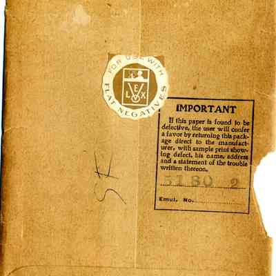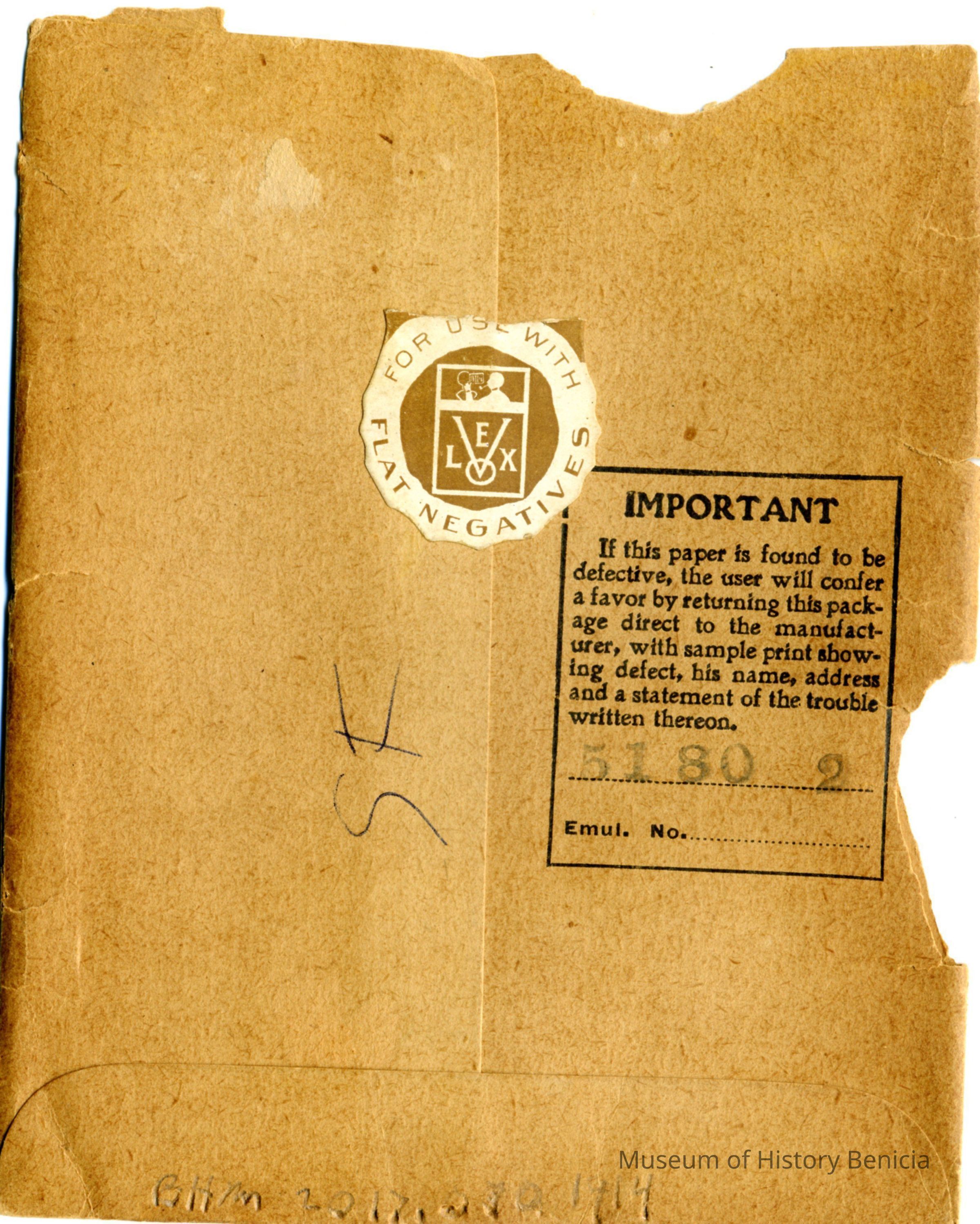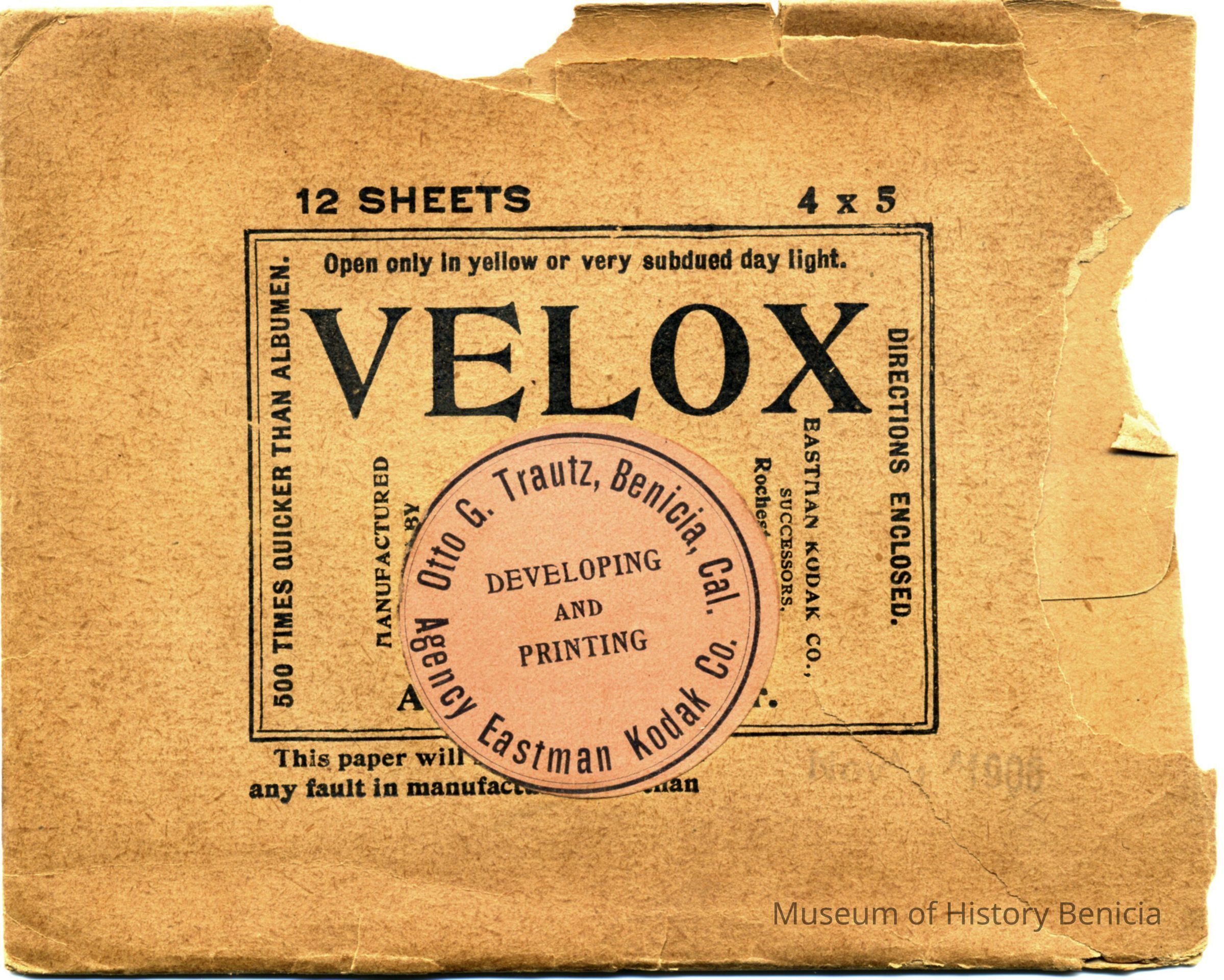 This is an envelope for Velox 4x5 developing paper. It has a stamp on it for Otto G. Trautz, Benicia, Cal. Agency Eastman Kodak Co. There were 12 sheets in this envelope but it is now empty. The back says it is for use with flat negatives. It also has the number 5180 2 stamped on the back. Someone has written "SF" on the back. (This envelope may have been used to store exposed negatives.) It also says that this paper is 500 times faster than Albumen.Collection