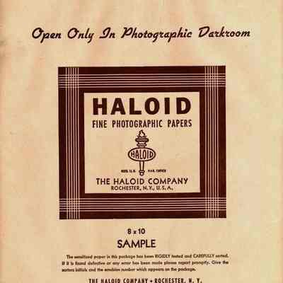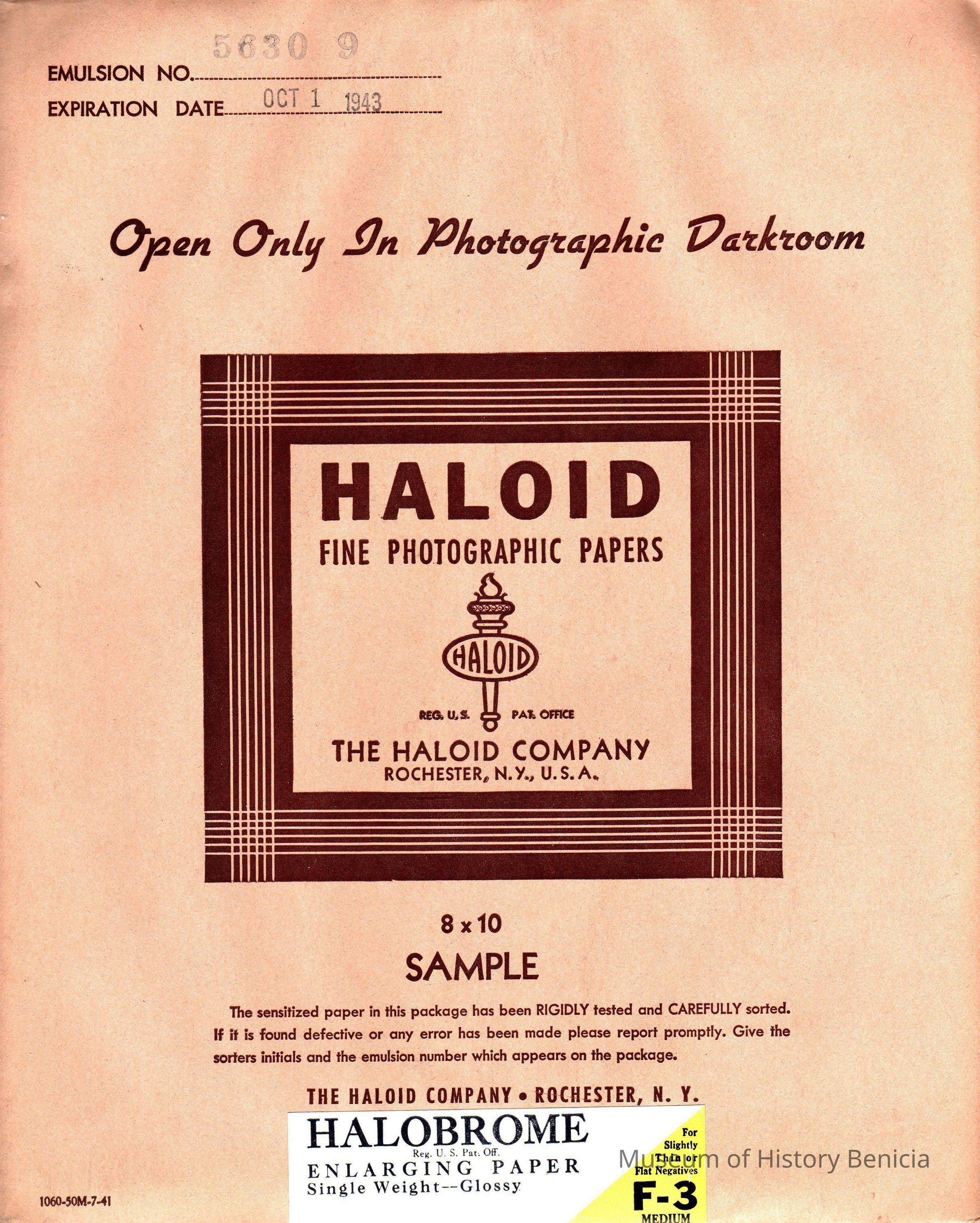 Haloid photo enlarging paper. 8x10 expired 10/01/1943. Halobrome unopened sample package type "F-3" for thin or flat negatives.