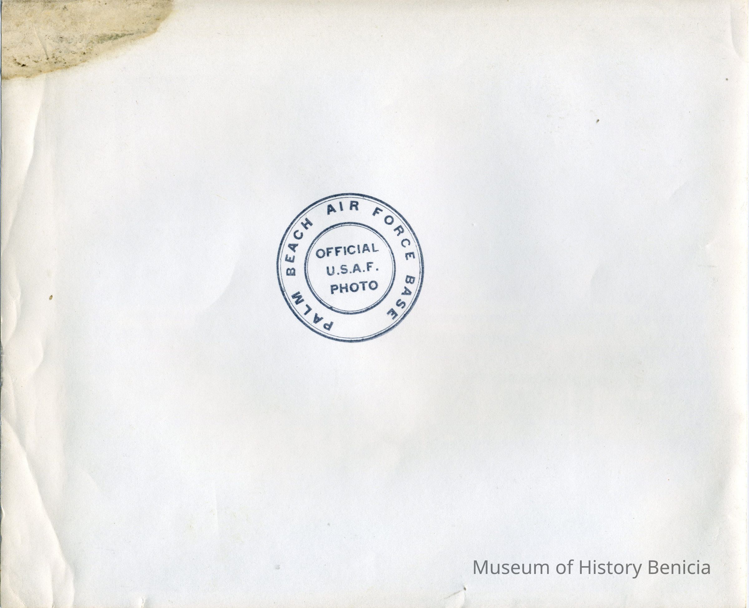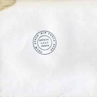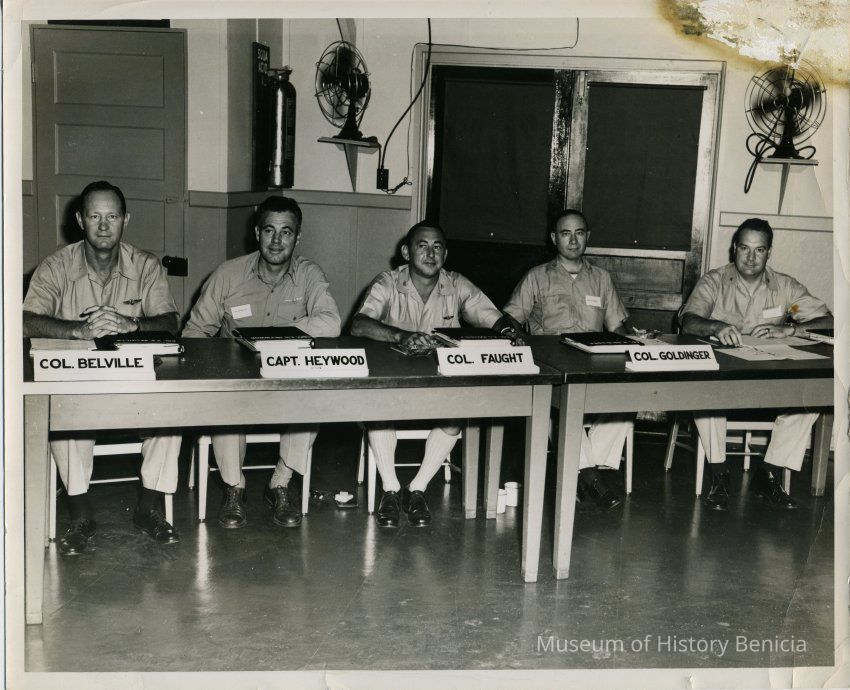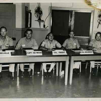 Informal photograph of Milton Goldinger seated behind a set of tables along with four other men; inc Col Belville, Capt Heywood, Col Faught, and an un-named military person. Undated. 'Official U.S.A.F. Photo Palm Beach Air Force Base' is stamped on back.Collection