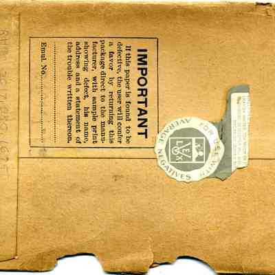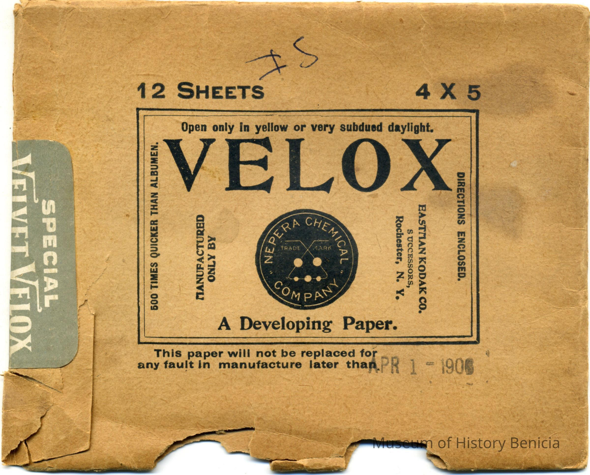 This is an envelope for Velvet Velox 4x5 developing paper. There were 12 sheets in this envelope but it is now empty. It also has the number 2124? stamped on the back. It also says that this paper is 500 times faster than Albumen. The front shows a date of 04/01/1906. The seal on the back says it is for use with Average Negatives.Collection