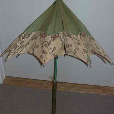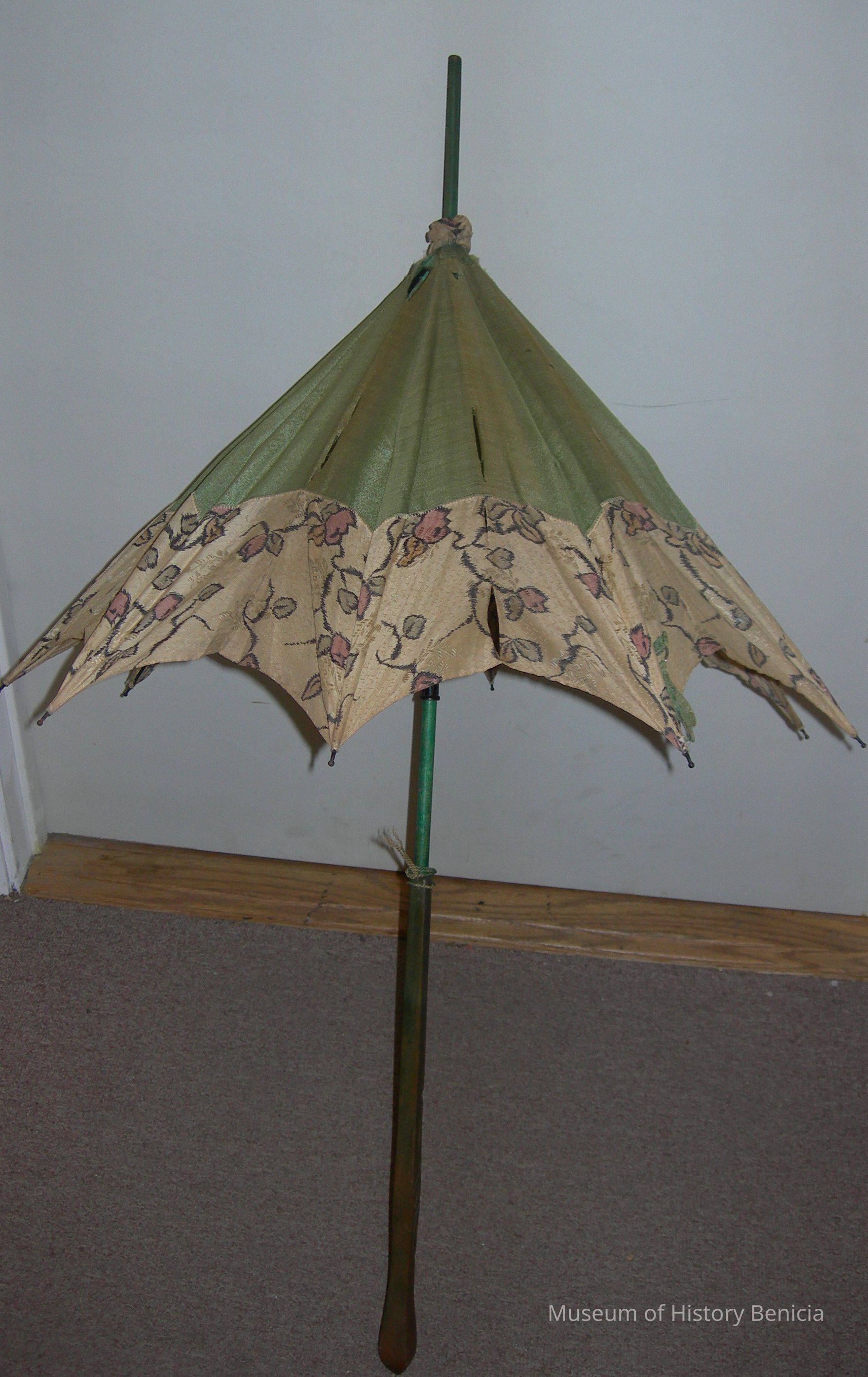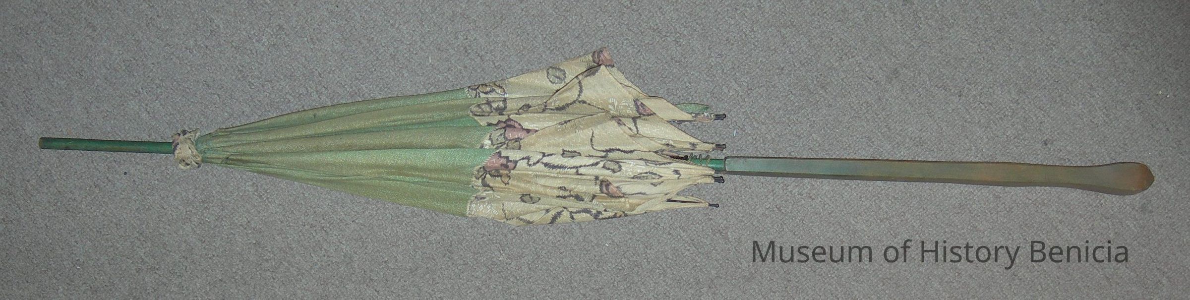 Parasol - green stained, carved wooden handle, 16" long; canopy is green with flower designs on a beige edge strip; canopy is 19-1/2" long (closed); total length is 40";