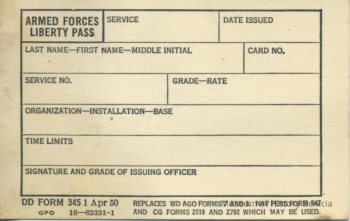 Blank Boxes: Service, Date Issued, Last Name - First Name - Middle Initial, Card No. Service No., Grade-Rate, Organization - Installation - Base, Time Limits, Signature and Grade of Issuing Officer. Back is blank.