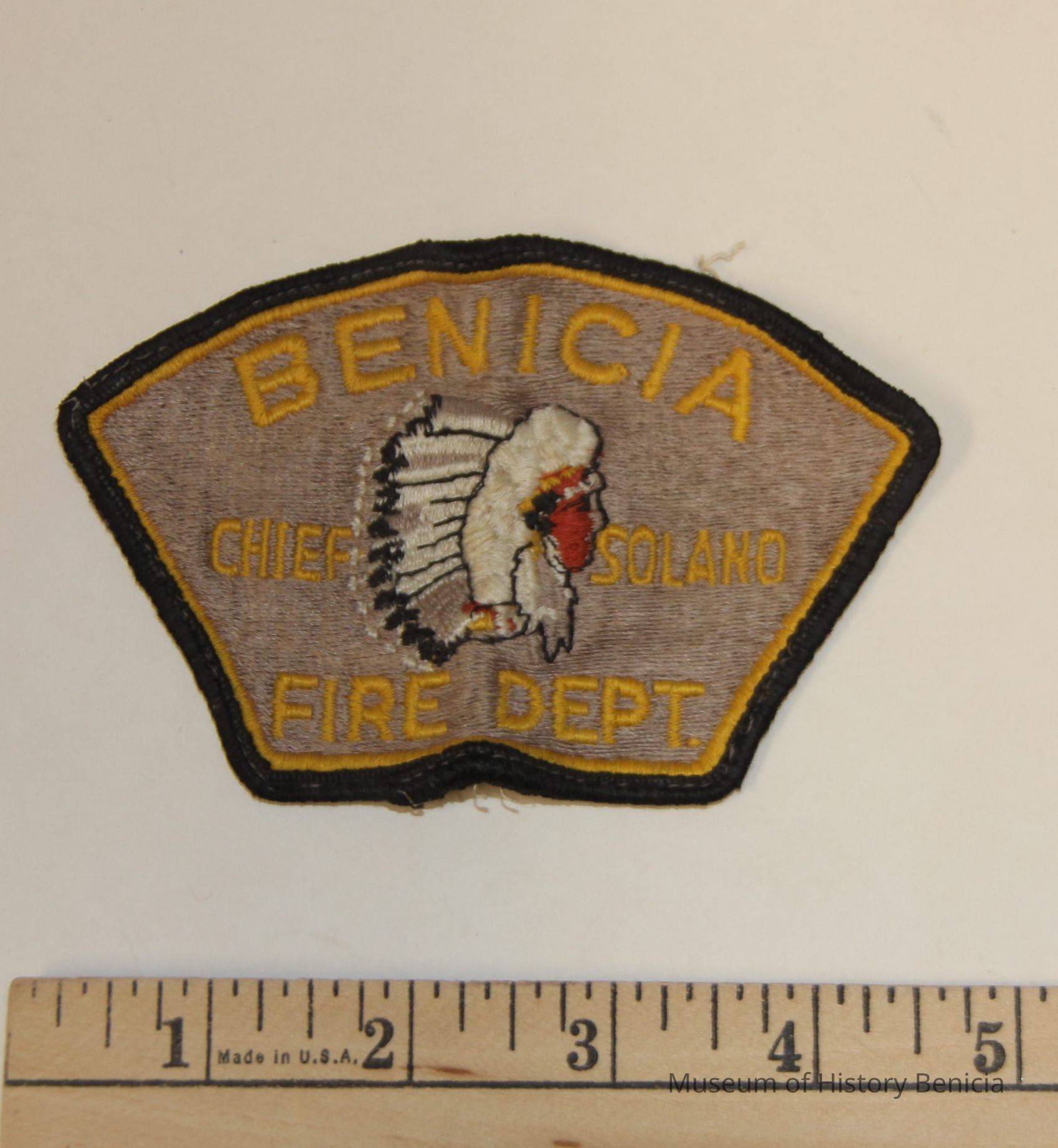 Benicia Fire Department patch -- Chief Solano version. Old and faded. Black and yellow embroidery on silver background. Approximately 5 by 2.5 inches.