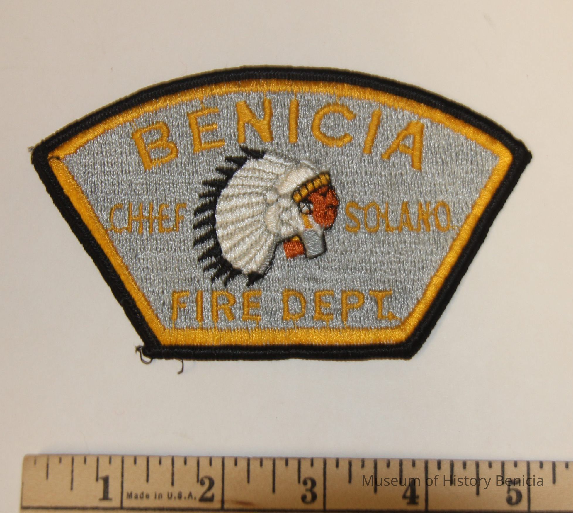 Benicia Fire Department patch -- Chief Solano version. Black and yellow embroidery on silver background. Approximately 5 by 2.5 inches.