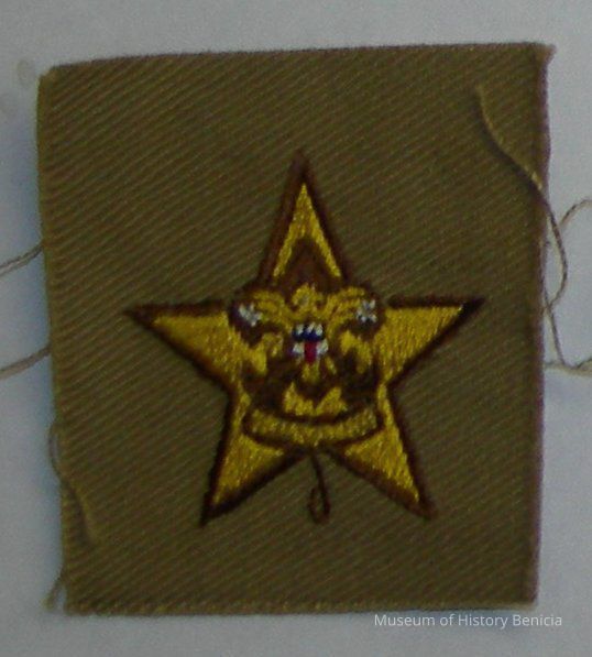 Boy Scout Merit Badge: on fine tan twill cloth, embroidered star with crest and "Be Prepared" inside = rank merit badge