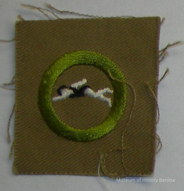 Boy Scout Merit Badge: on fine tan twill cloth, embroidered swimmer inside green ring = swimming merit badge