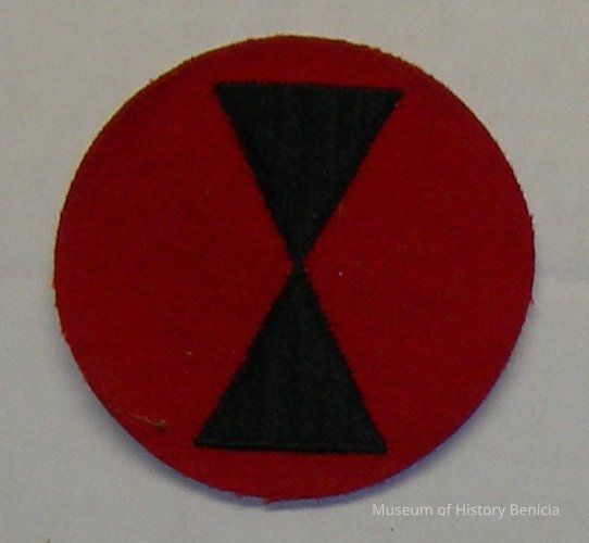 Round military patch from World War II - Seventh Division Pacific in WWII (formed in 1918) red background with black hourglass