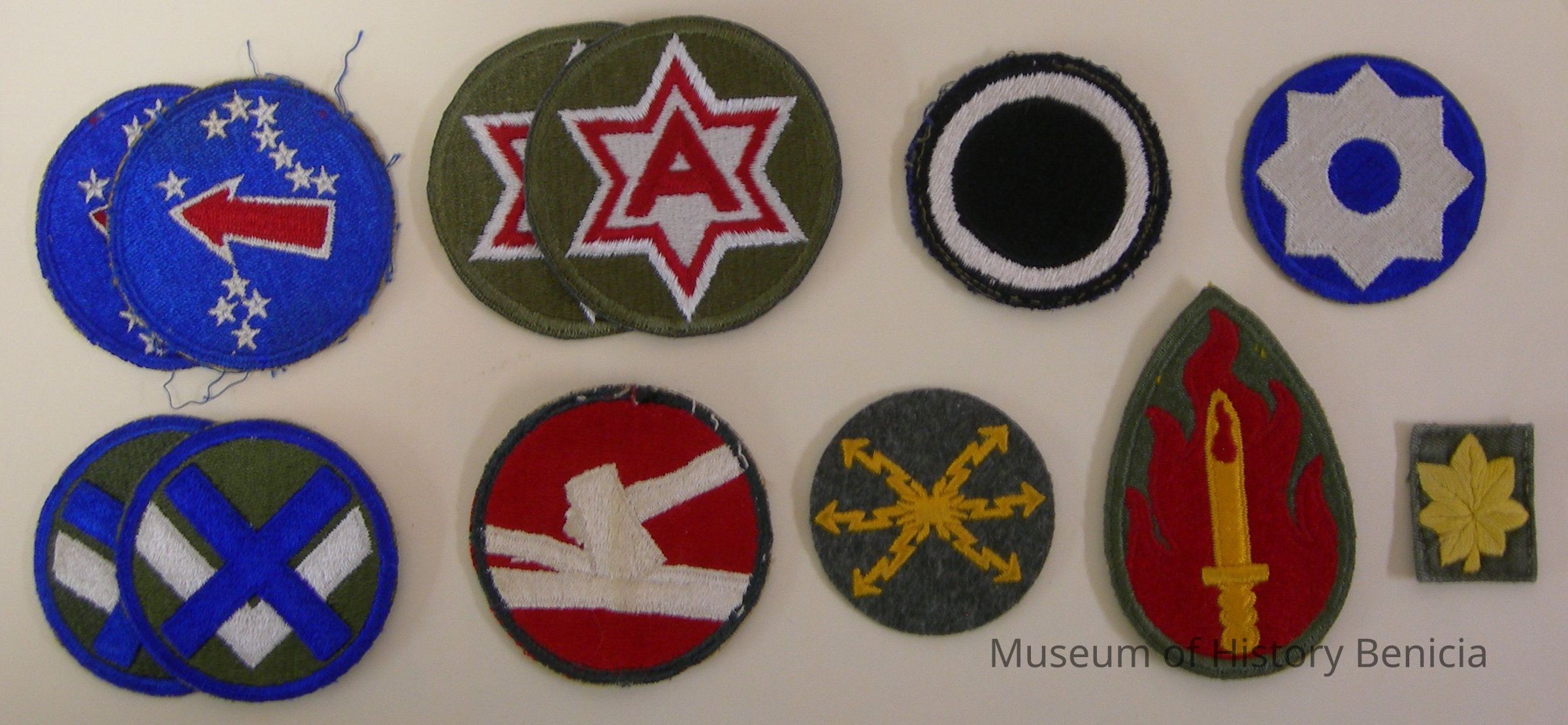 Group of 12 Military Patches including: U.S. Army Pacific Theater (2); 84th Army Division ; 6th Army (2); 1st Corps; 8th Service Command; 63rd Regional Support Command; 15th Corps (2); Major Gold Oak Leaf and two that are unidentified.
