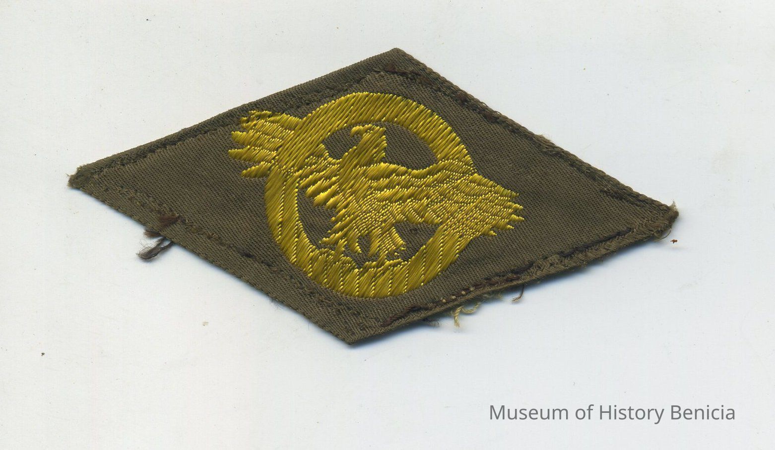 Military Patch diamond shape, green khaki background embroidered gold eagle in a circle;