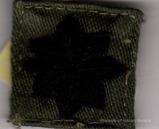 square with black embroidered oak leaf (major or lt. colonel) on green twill cloth, edge is hemmed, to be sewn on uniform