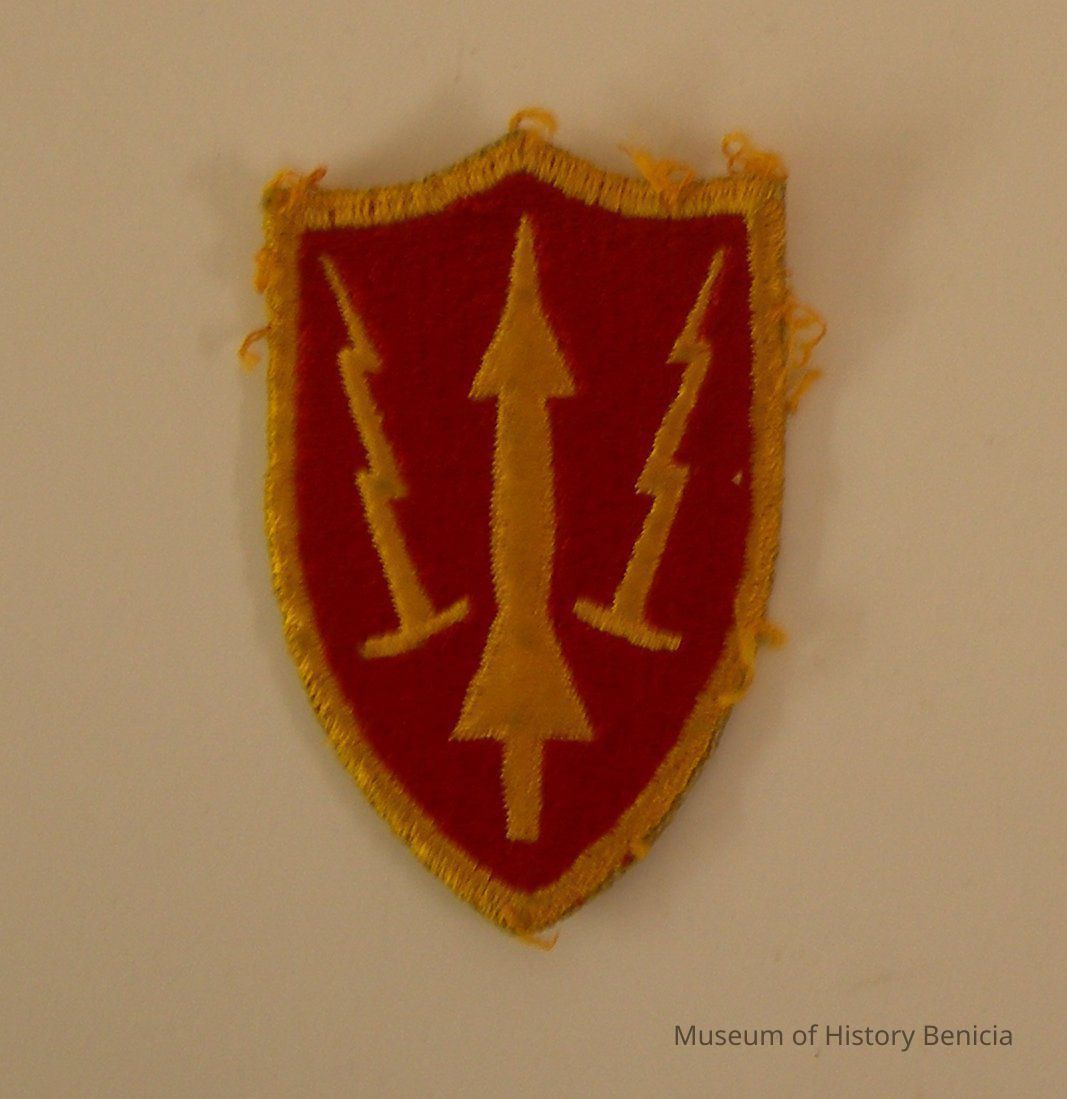 Military Patch - Missile Air Defense Shield-shaped, red with gold; 3" long x 2" wide