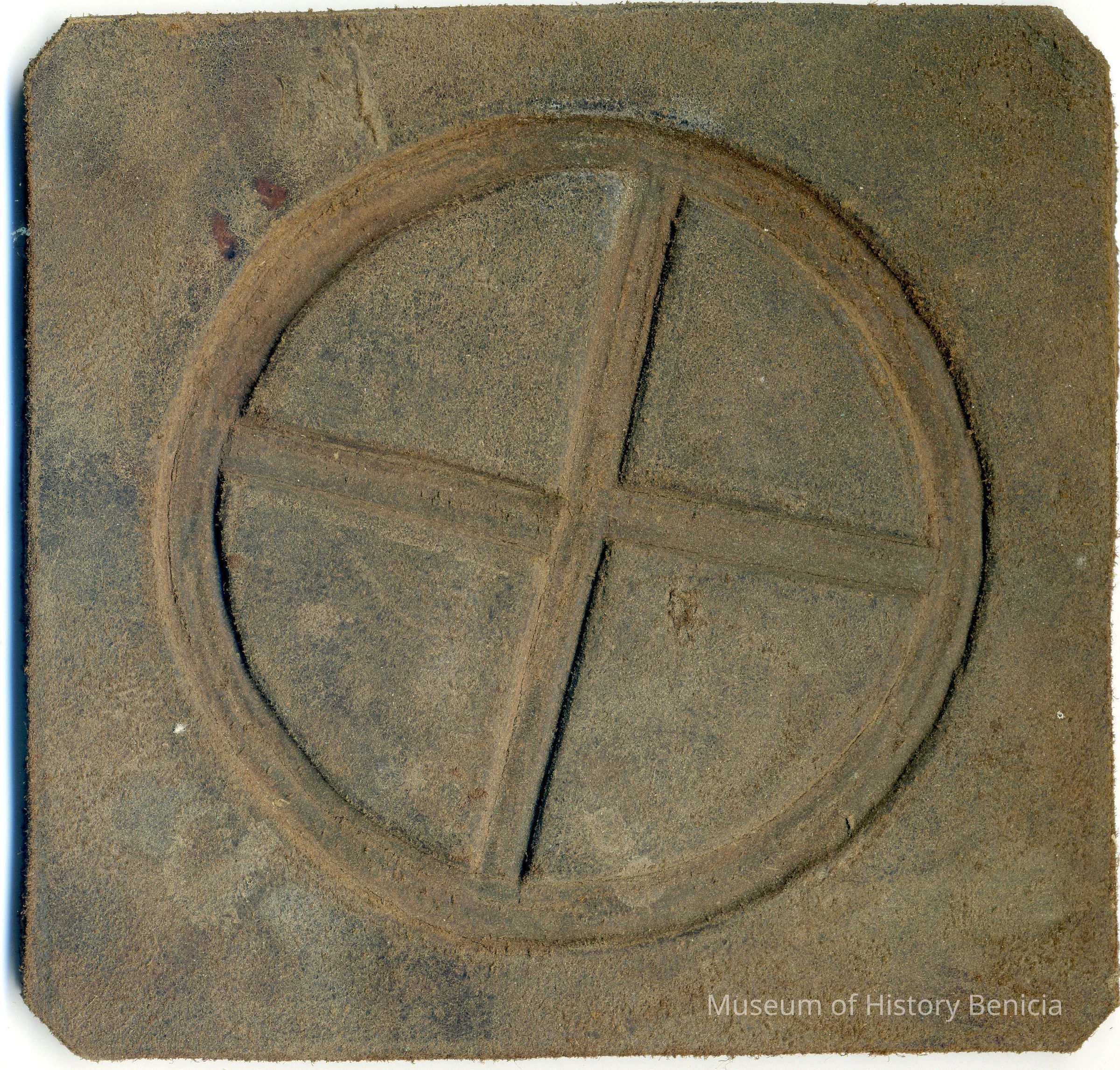 No copy of the recording is attached to the back of the leather. The brand is a plus mark inside of a circle, the lines of the mark are connected to the circle but the placement in not noted.Collection