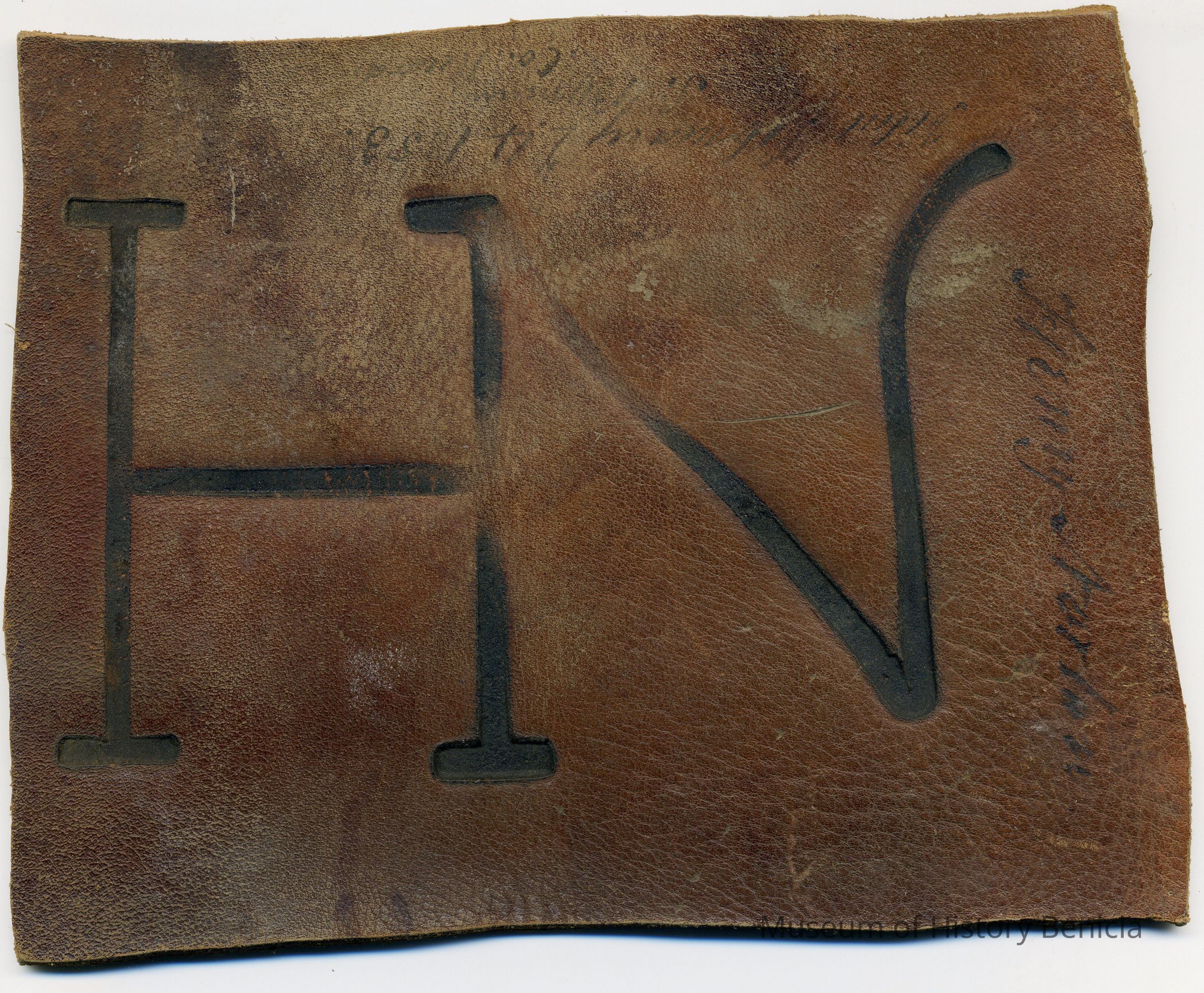 Sample brand on a piece of leather for Henry Norton, registered on February 24, 1853, and is not written in a Ledger of the Solano County Recorder 1855-1916.
