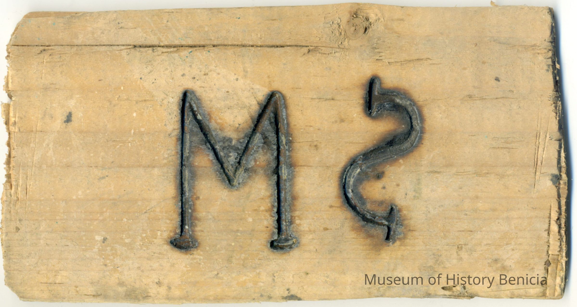 Sample brand on a piece of wood for Manuel Sapteiro & Co., registered on March 16, 1885, as written in a Ledger of Solano County Recorder 1855-1916 (page 93). [see 1986.010.0148]