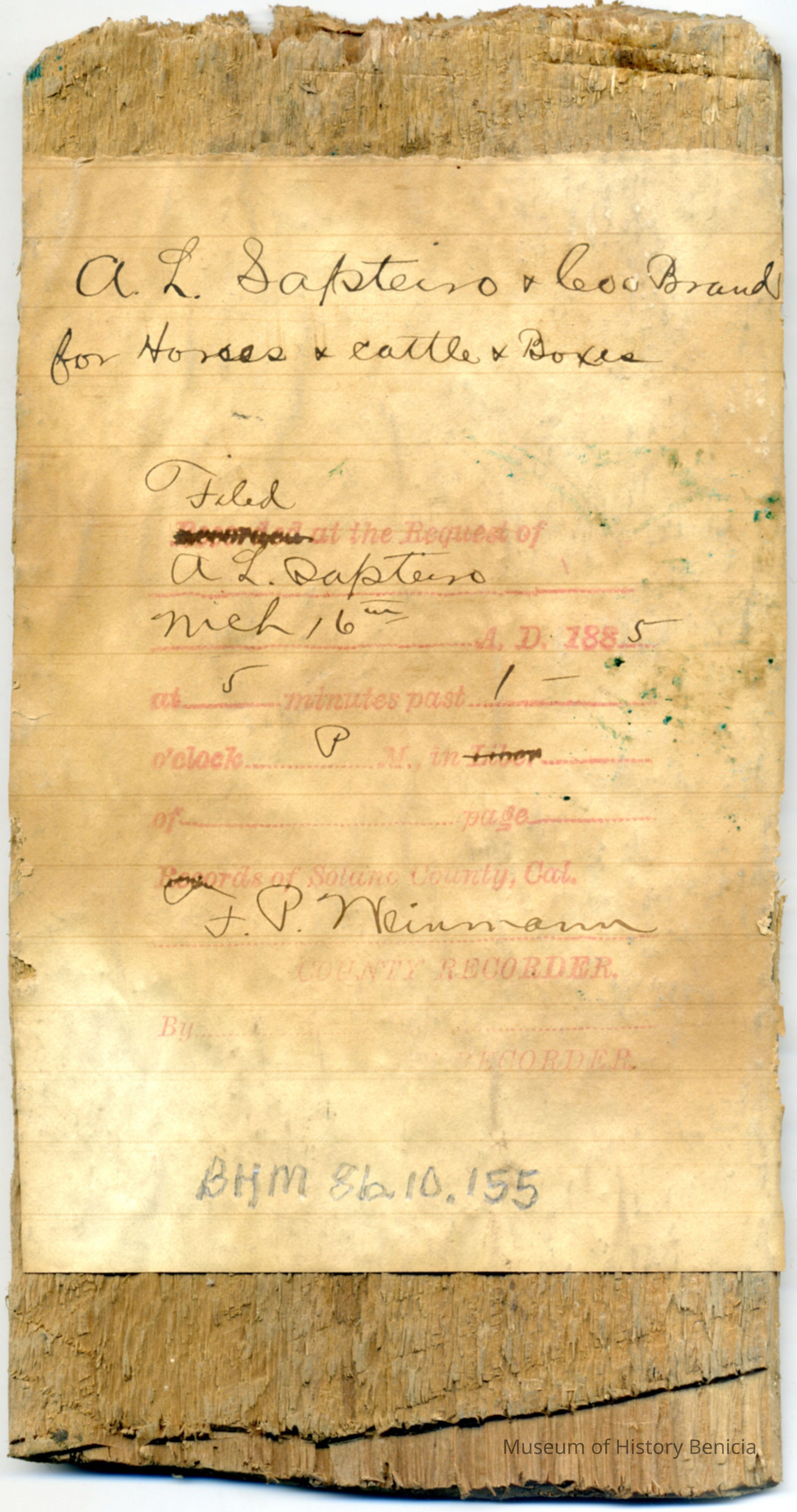 A partial copy of the registration is adhered to the back of the piece of wood. The brand is a capital "M" on the left and a backward capital "S" on the right. It is used on horses, cattle and boxes. A notation at the bottom of the page: "The above brand is hereby assigned to John F. Avilla. Fairfield September 7, 1885. A. L. Sapteiro, Witness F/P.Neinmann, Co. Recorder."Collection