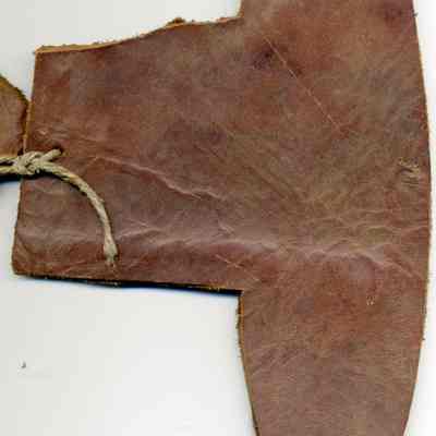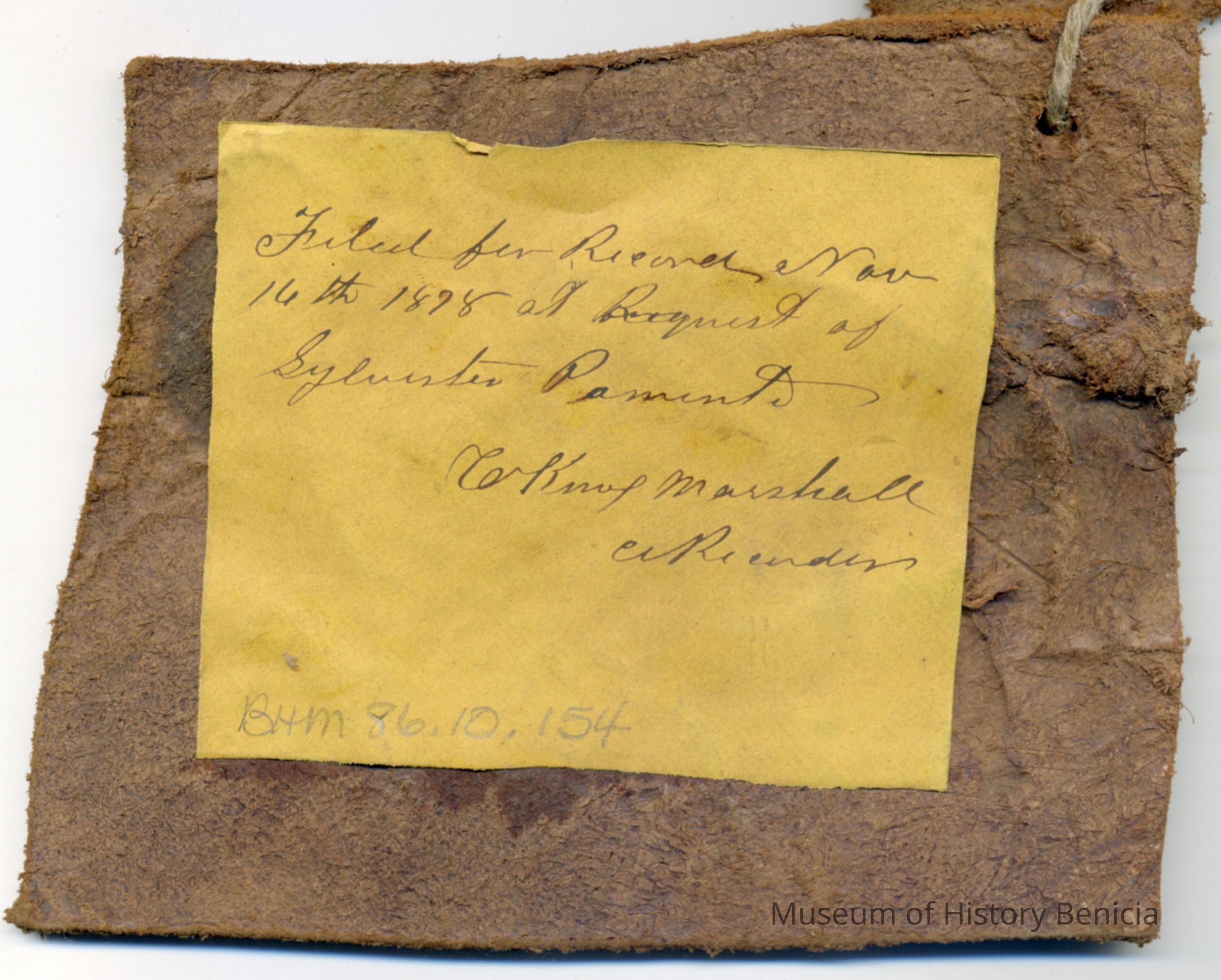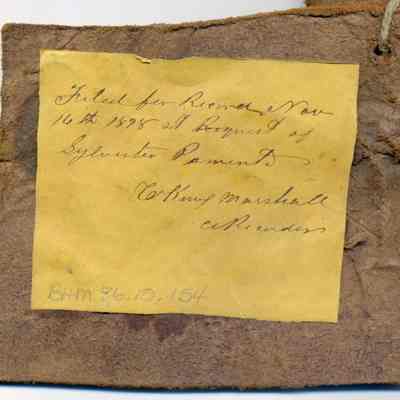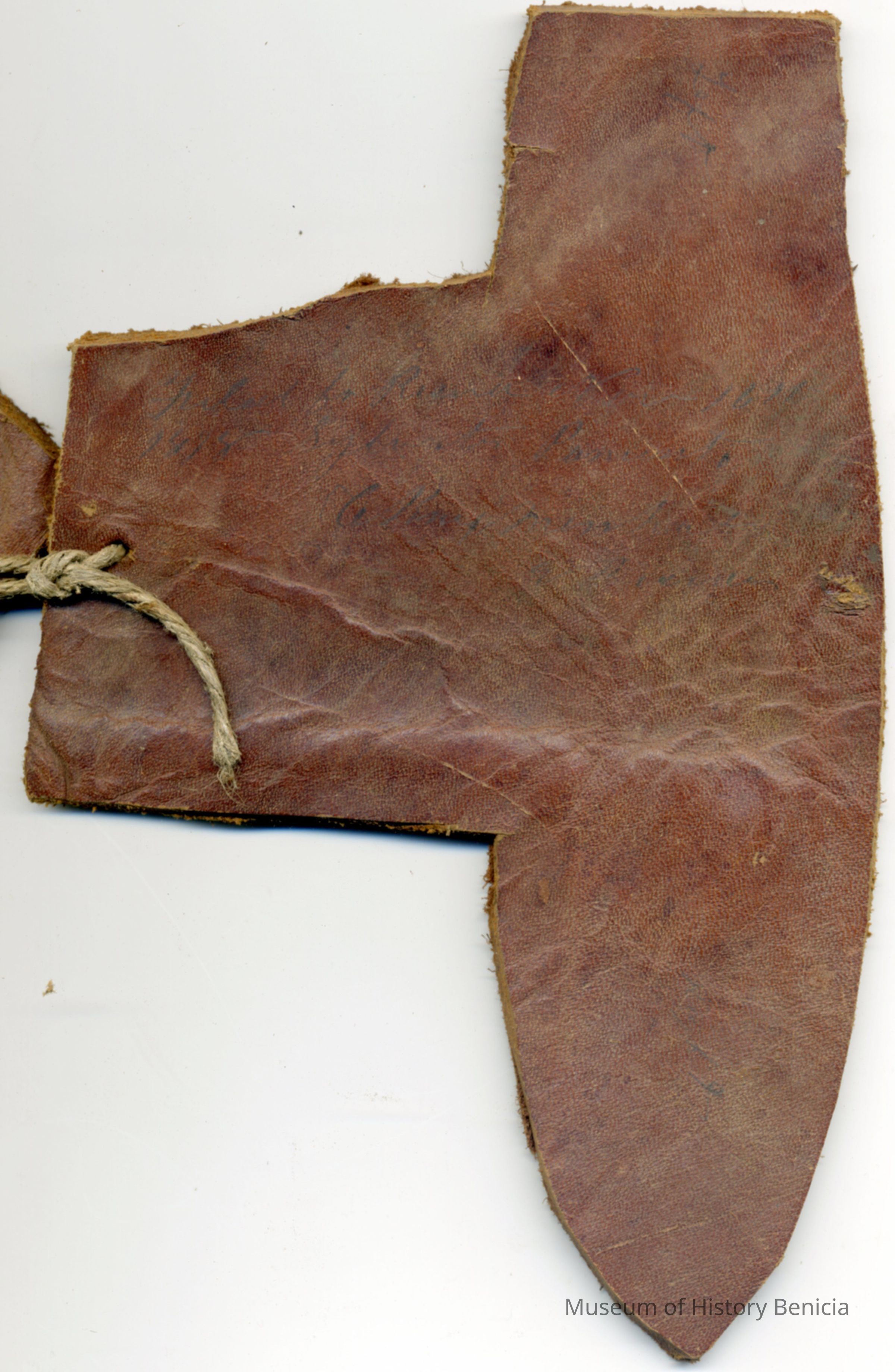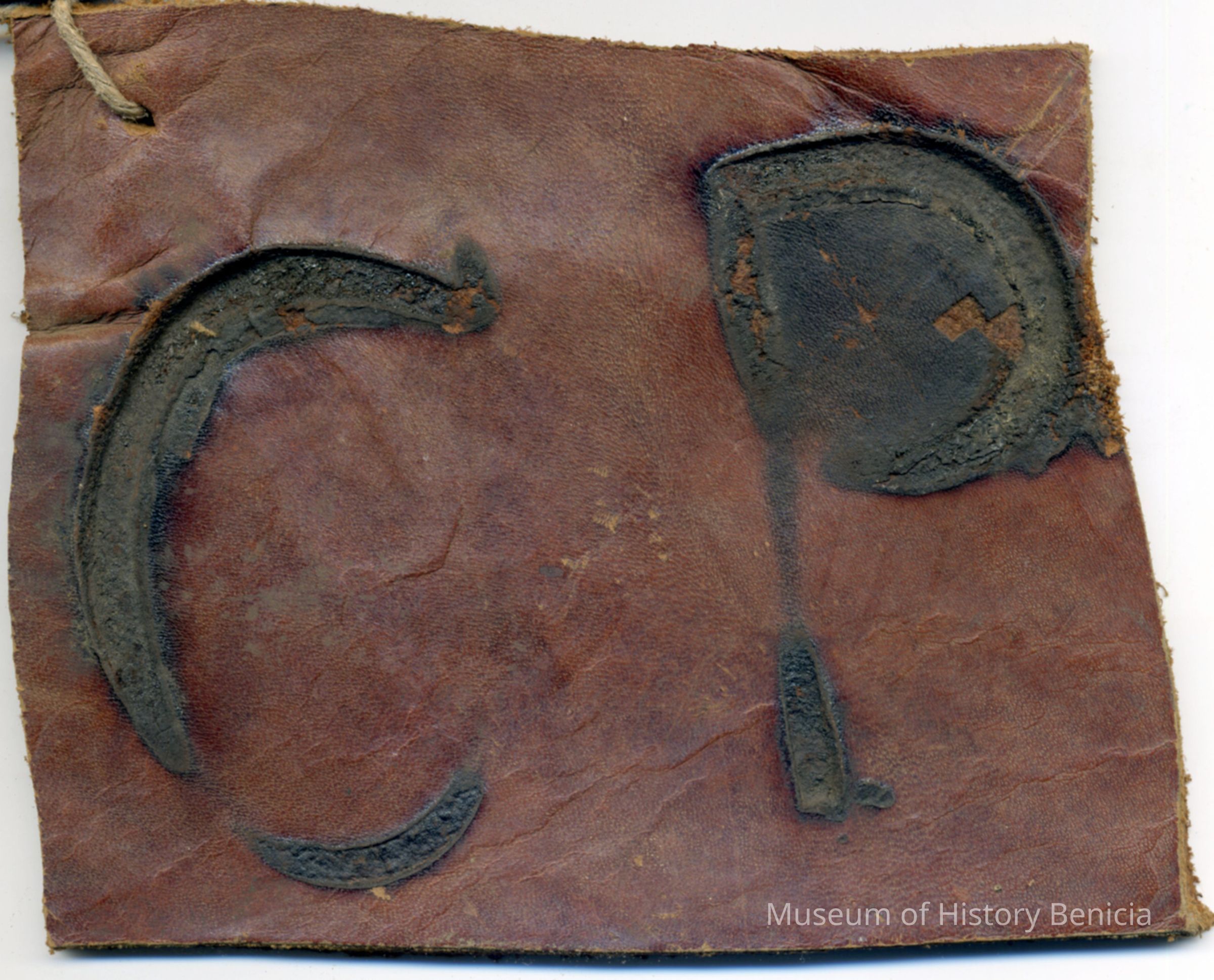 A partial copy of the registration is adhered to the back of one of the pieces of leather. The brand is "C P" but no placement is noted. A separate piece shows the earmarking and the pieces are attached to each other with a piece of twine.Collection