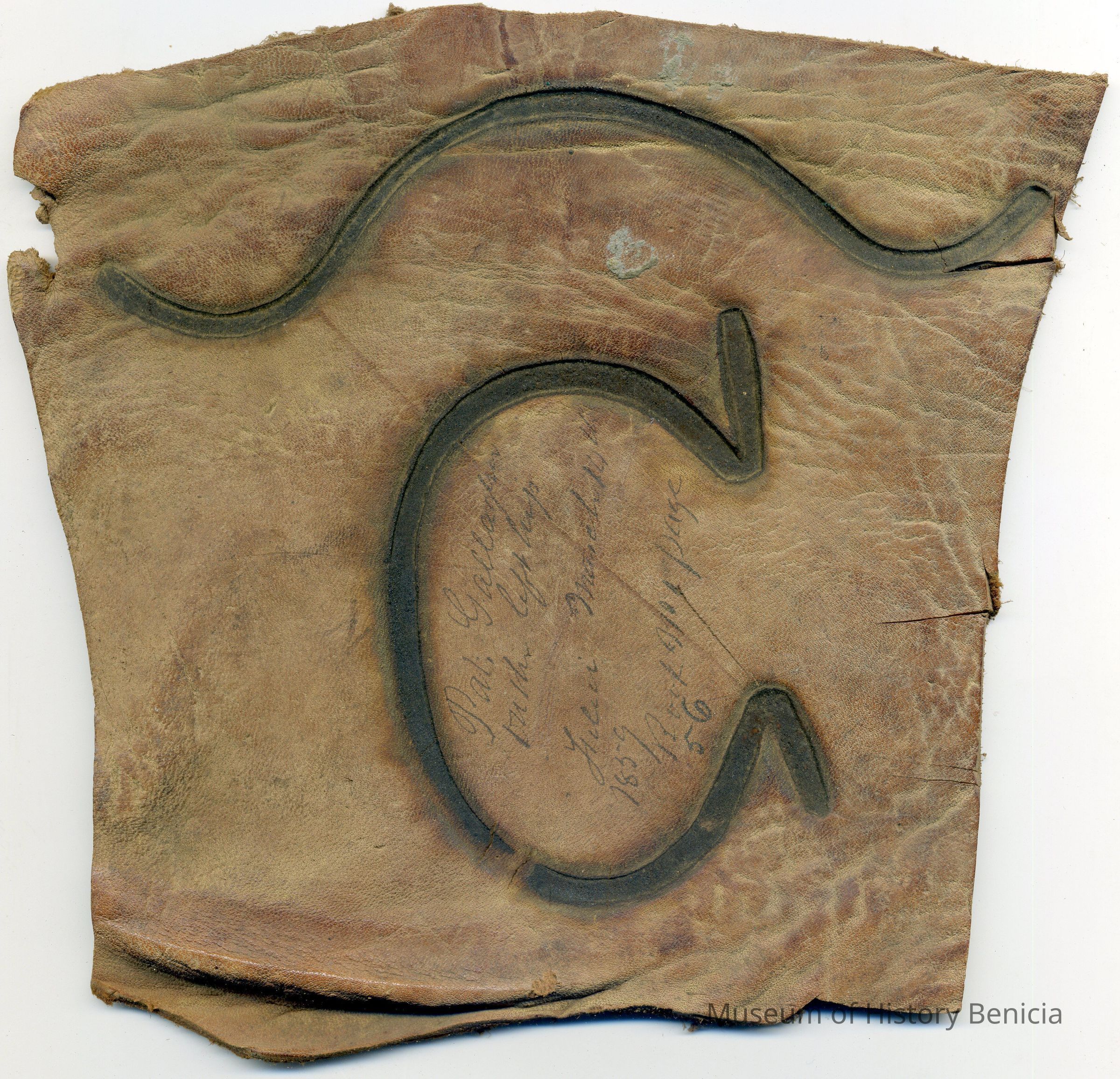 No copy of the original recording is adhered to the back of the leather, however information is written in ink on the front of the piece . The brand is a "C" with a wavy line above it and is placed on the left hip.Collection