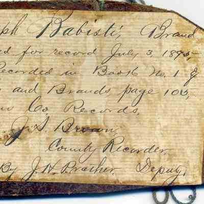 Sample brand on a piece of leather for Joseph Babisti, registered on July 3, 1895, as written in a Ledger of the Solano County Recorder 1855-1916. (page 105)