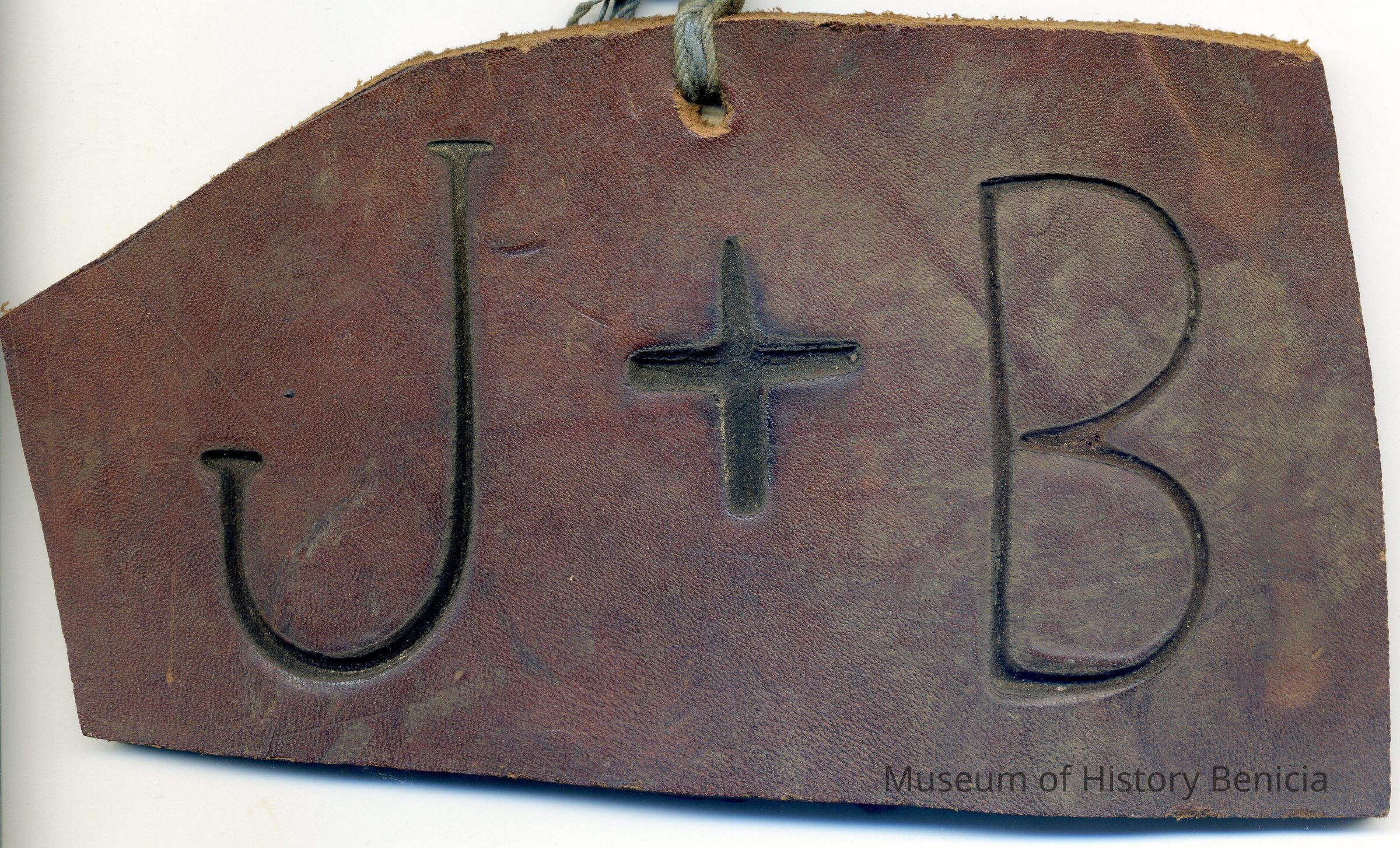 A partial copy of the original recording is adhered to the back of the leather. The brand is "J + B" and placement is not noted. A piece of string is attached to a hole in the middle of the upper area.Collection
