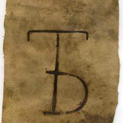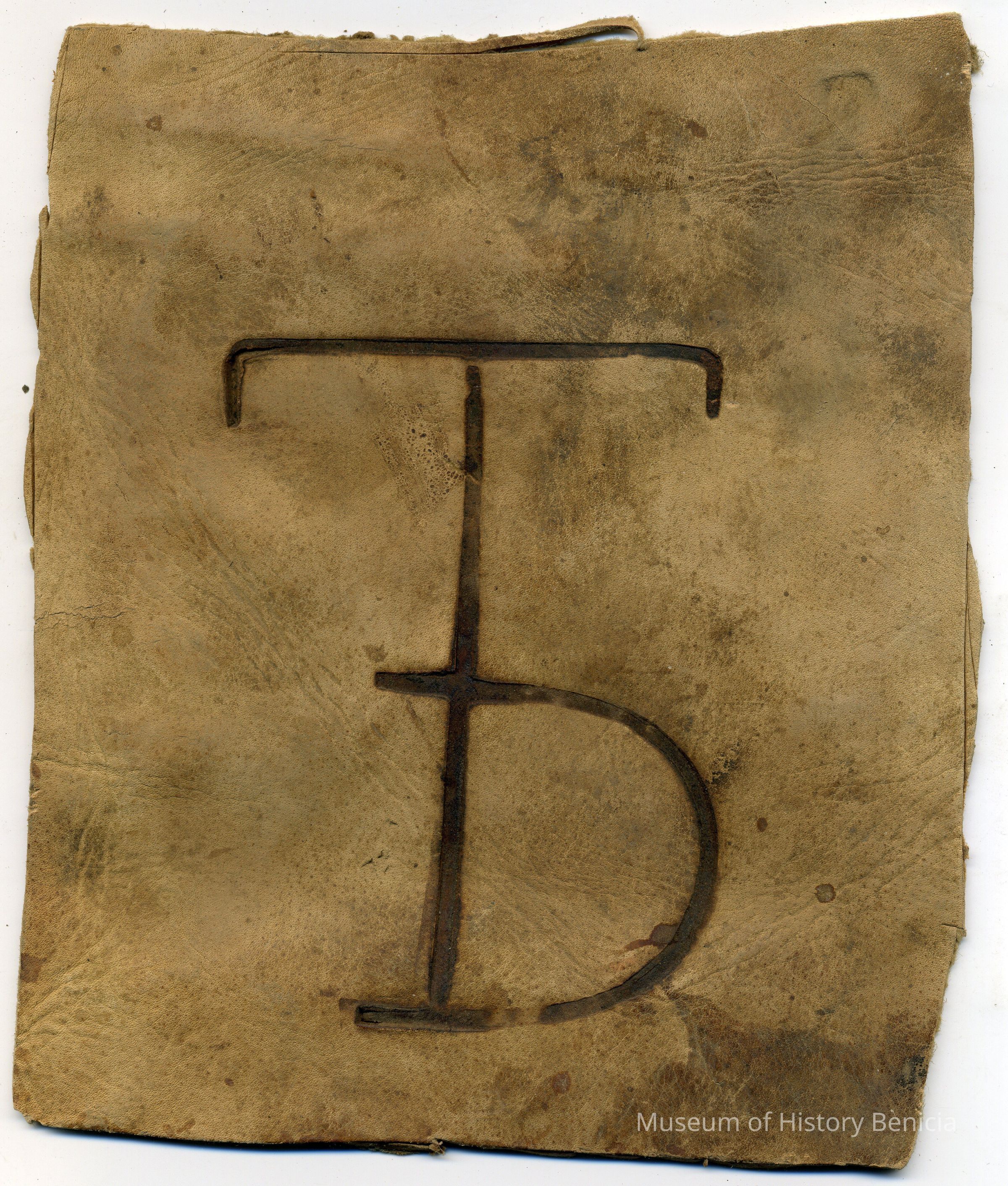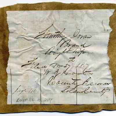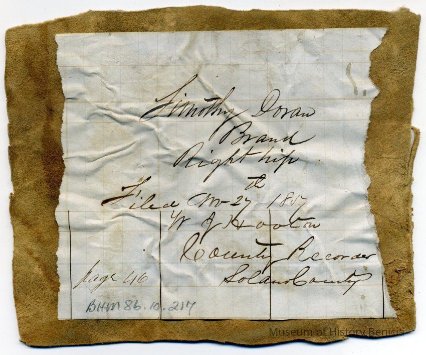 Sample brand on a piece of leather for Timothy Doran, registered on November 27, 1857, and is written in a Ledger of the Solano County Recorder 1855-1916. (page 46)