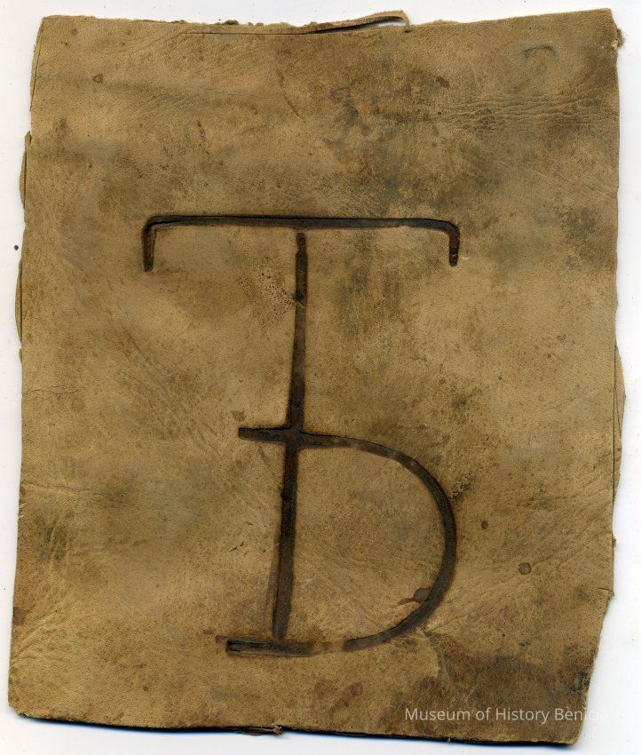 A partial copy of the original recording is adhered to the back of the piece. The brand is a large capital T with a small capital D attached to the right side of the T's upright. Placement is on the right hip.Collection